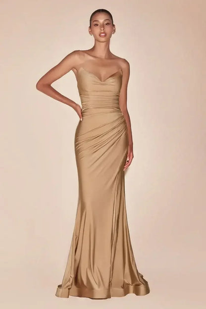 AVA POINTED V-NECKLINE GOWN - NUDE GOLD - STRAPLESS STRETCH SPANDEX SATIN FITTED GOWN