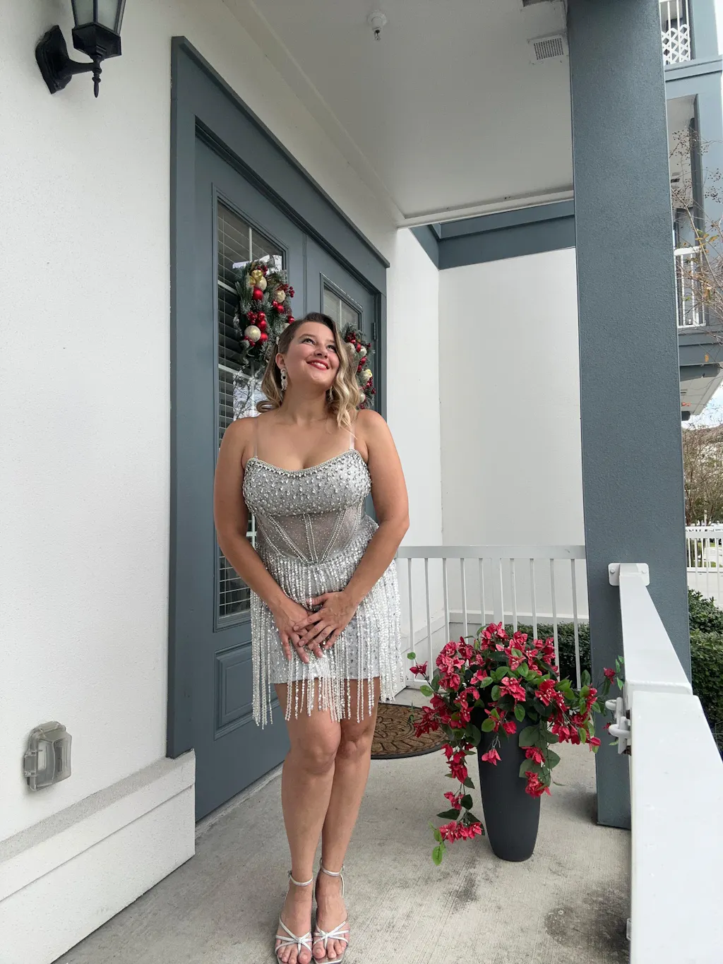 Step into the spotlight with this unique and eye-catching strapless fringe style short dress that is sure to make a statement. The dress is fully beaded, adding a touch of sparkle and glamour to your look. The sheer boned waistline creates a modern and flattering silhouette, while the straight zipper back ensures a secure and seamless fit. Ideal for homecoming and semi formal occasions where you want to showcase your bold and stylish side.