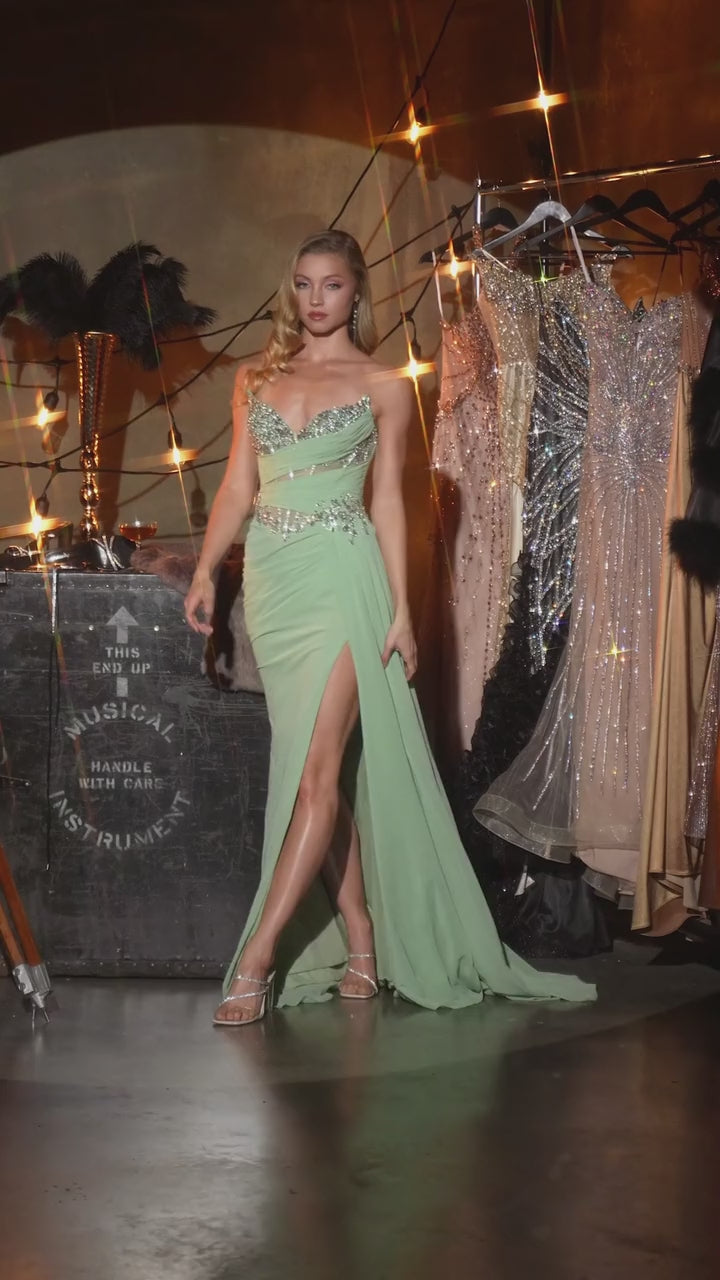Crafted for moments that command the spotlight, the Bowie Gown delivers refined glamour with a romantic edge. This fitted silhouette features a sweetheart neckline accented by shimmering beadwork and delicate appliqué, drawing the eye to the sculpted bodice. Softly draped chiffon wraps the waist to create a flattering hourglass shape, while subtle sheer paneling adds modern allure. The flowing skirt falls into a graceful train and is finished with a thigh-high slit for elegant movement and drama. A stunning choice for prom, pageants, or any formal evening that calls for high-impact sophistication