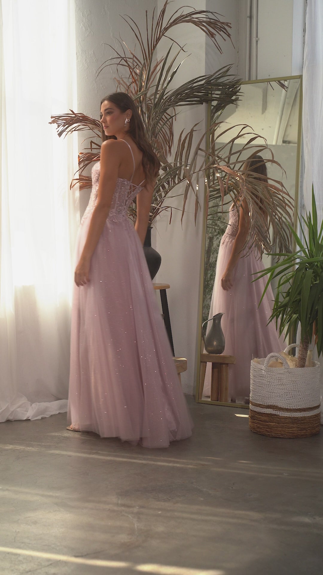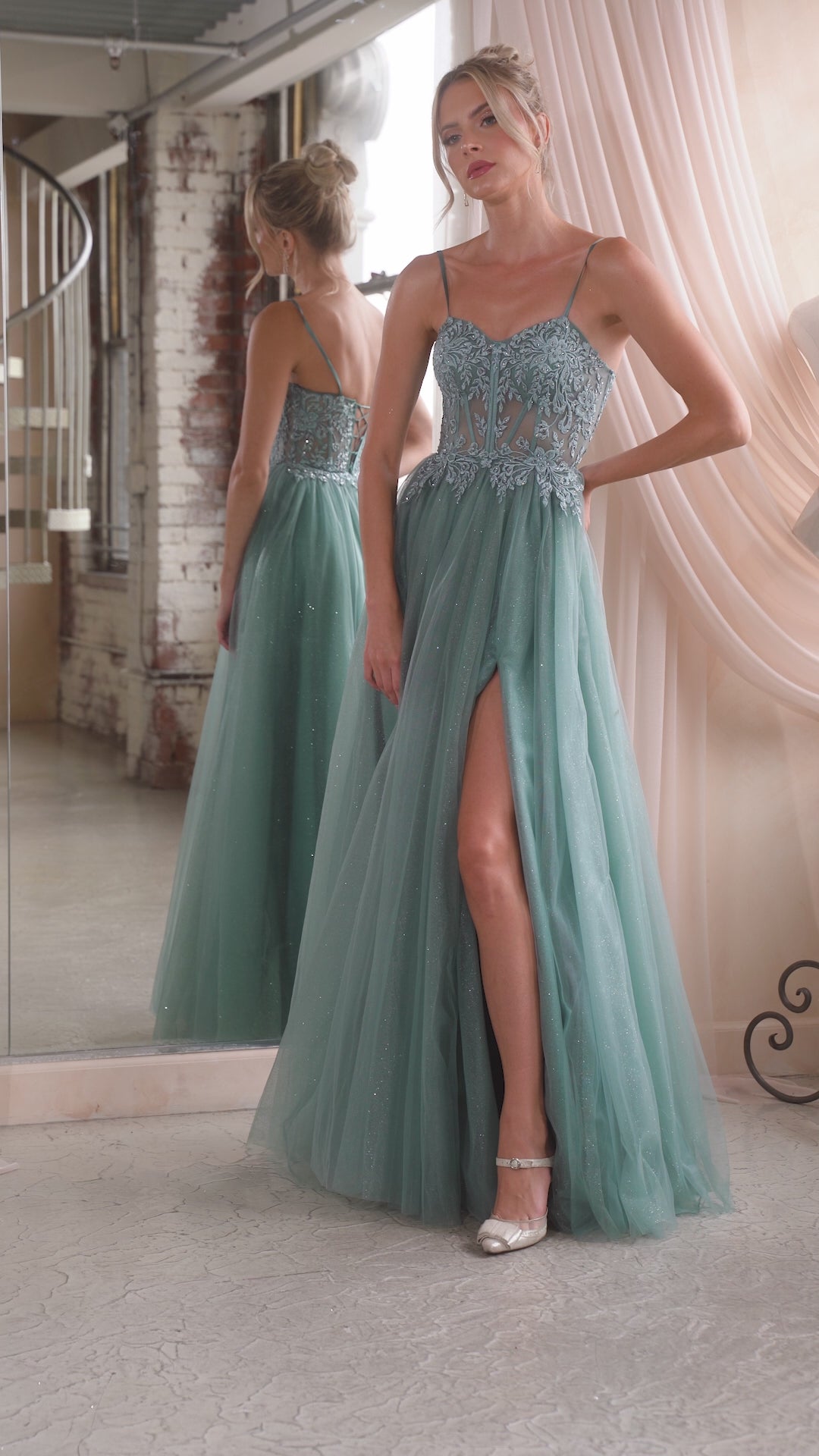 Step into a fairy tale with this enchanting lace and tulle ball gown. The A-line silhouette begins with a sheer bodice adorned with delicate lace embellishments, adding an ethereal touch. Thin straps complement the low back, finished with a lace-up corset closure for a perfect fit. The layered glitter tulle skirt flows gracefully, featuring a leg slit for ease of movement—ideal for dancing the night away. Whimsical and romantic, this gown will make you feel like royalty, creating a magical look for any special occasion.
