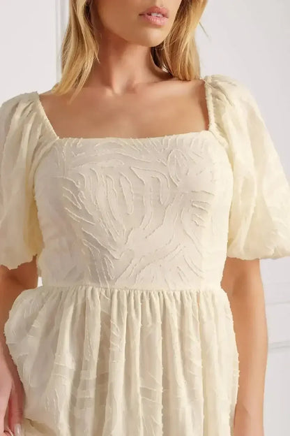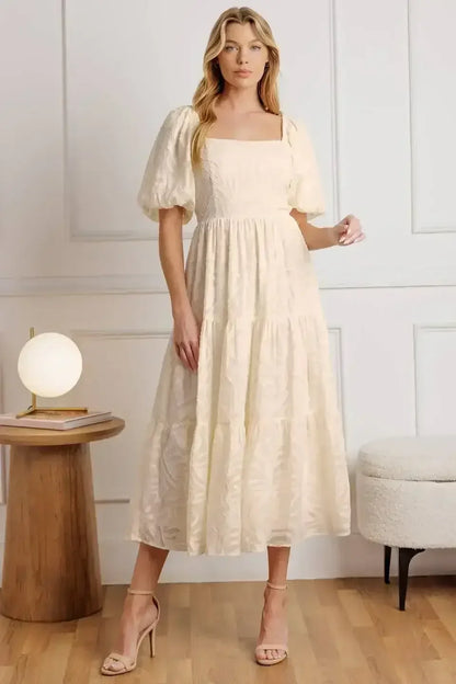 Discover effortless charm in the Brisk Adventures Embroidered Midi Dress, crafted from delicate woven fabric in a soft cream hue. This dress features an elegant squared neckline, romantic short puff sleeves, and a smocked bodice that provides a comfortable, flattering fit. A self-tie sash cinches the waist, leading to a graceful full skirt adorned with intricate embroidery for a touch of timeless detail.