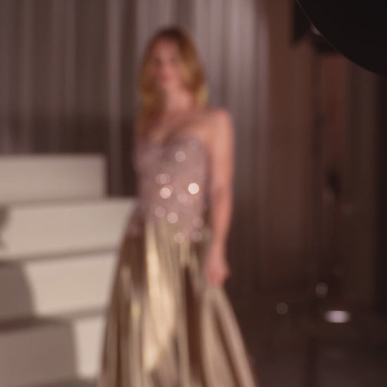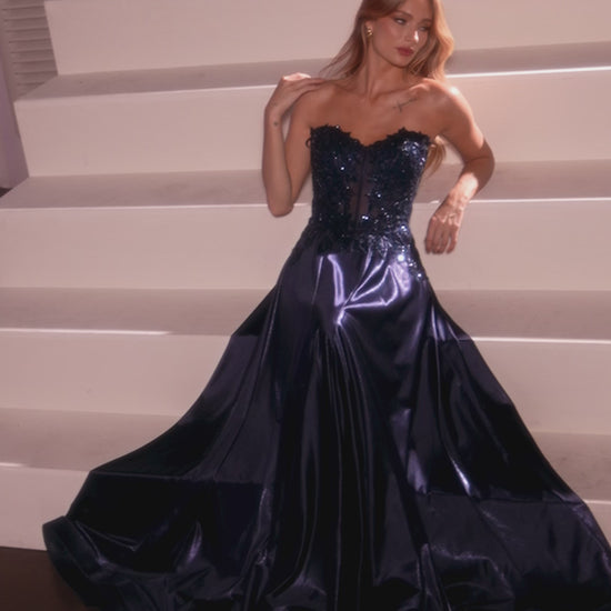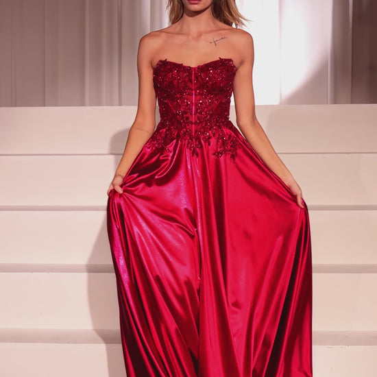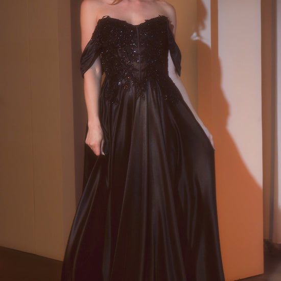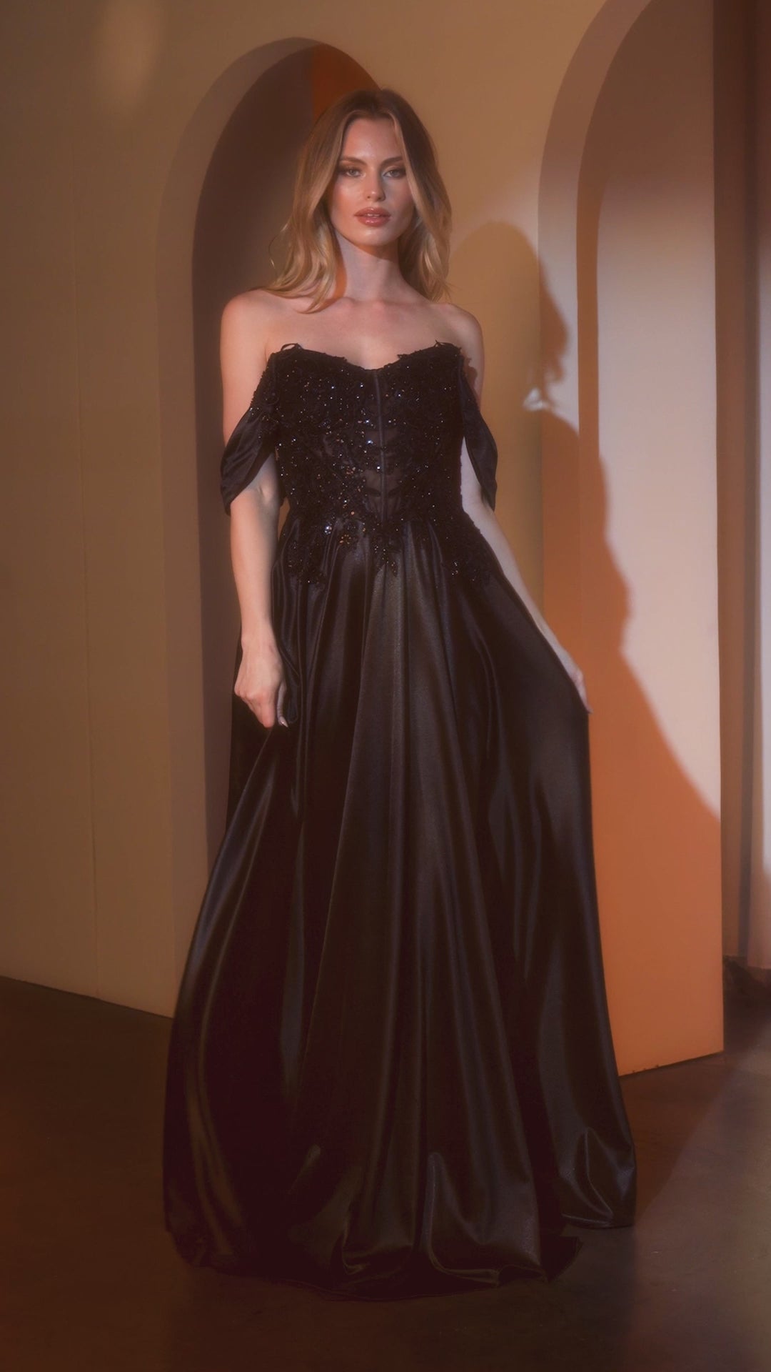 This A-line gown exudes timeless elegance and modern charm. The strapless neckline and structured boned bodice, adorned with intricate beaded lace appliqués, create a captivating and refined silhouette. Removable off-the-shoulder straps offer versatility, while the satin fabric flows gracefully, making it perfect for formal occasions like prom, galas, or black-tie events.