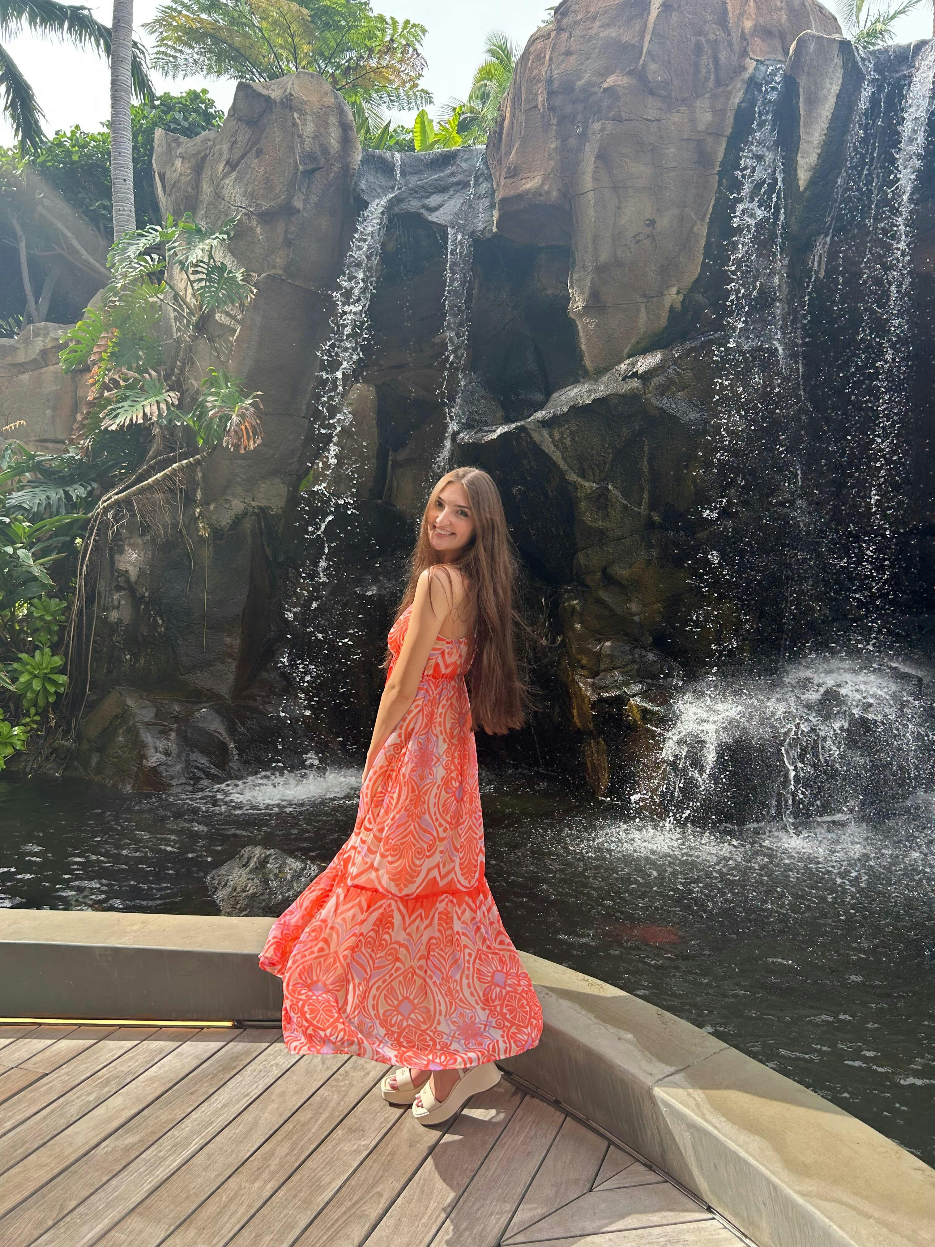Drift into summer ease with our Cabana Daydreams maxi dress in a dreamy coral print. Designed with a delicate cami top, elasticized empire waist with tie detail, and a romantic ruffled hemline, this flowy silhouette flatters every figure. Whether you're attending a seaside wedding, strolling through a resort town, or sipping spritzes under the sun, this dress promises effortless elegance and all-day comfort.