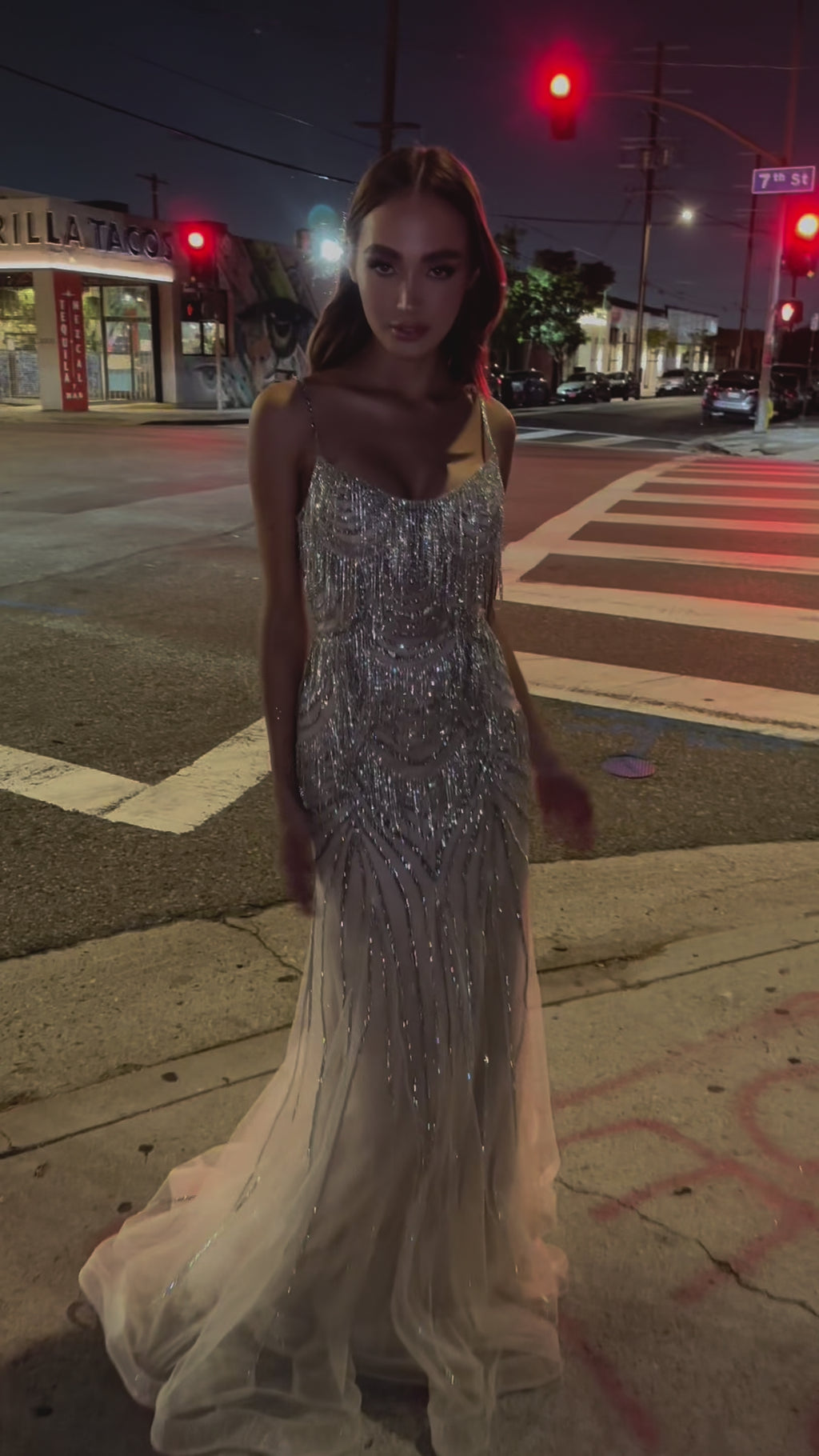 Turn heads and steal the spotlight in this breathtaking fringe-embellished mermaid gown, designed for unforgettable moments. The fitted mermaid silhouette accentuates an hourglass figure, blending glamour and sophistication effortlessly. A silver embellished tulle overlay sparkles with every step, while the nude lining enhances your natural shape. The scoop neckline with delicate thin straps is adorned with intricate embellishments, and rhinestone fringe details cascade elegantly, adding movement and shimmer. Perfect for evenings spent dancing, grand entrances, or special occasions, this gown promises an impactful entrance that won’t be forgotten