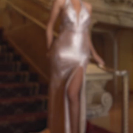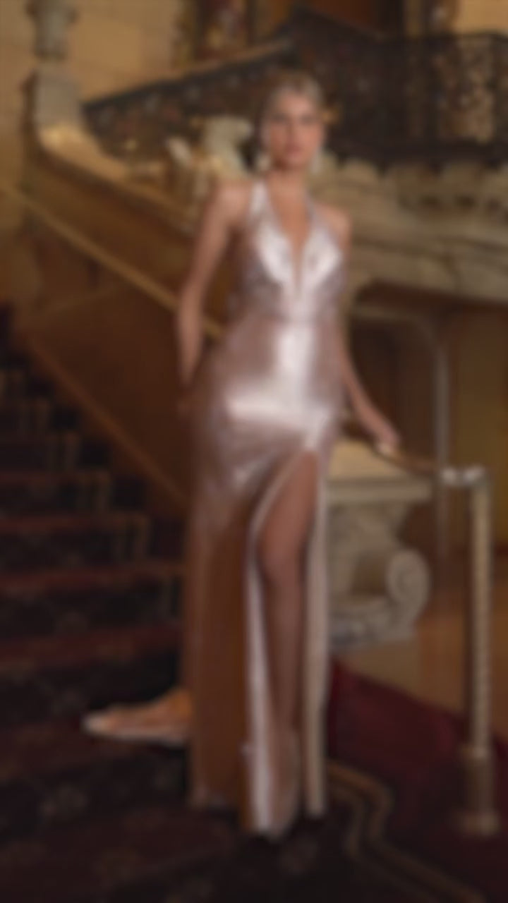 Design: Deep V halter neckline, embellished with rhinestones, leg slit