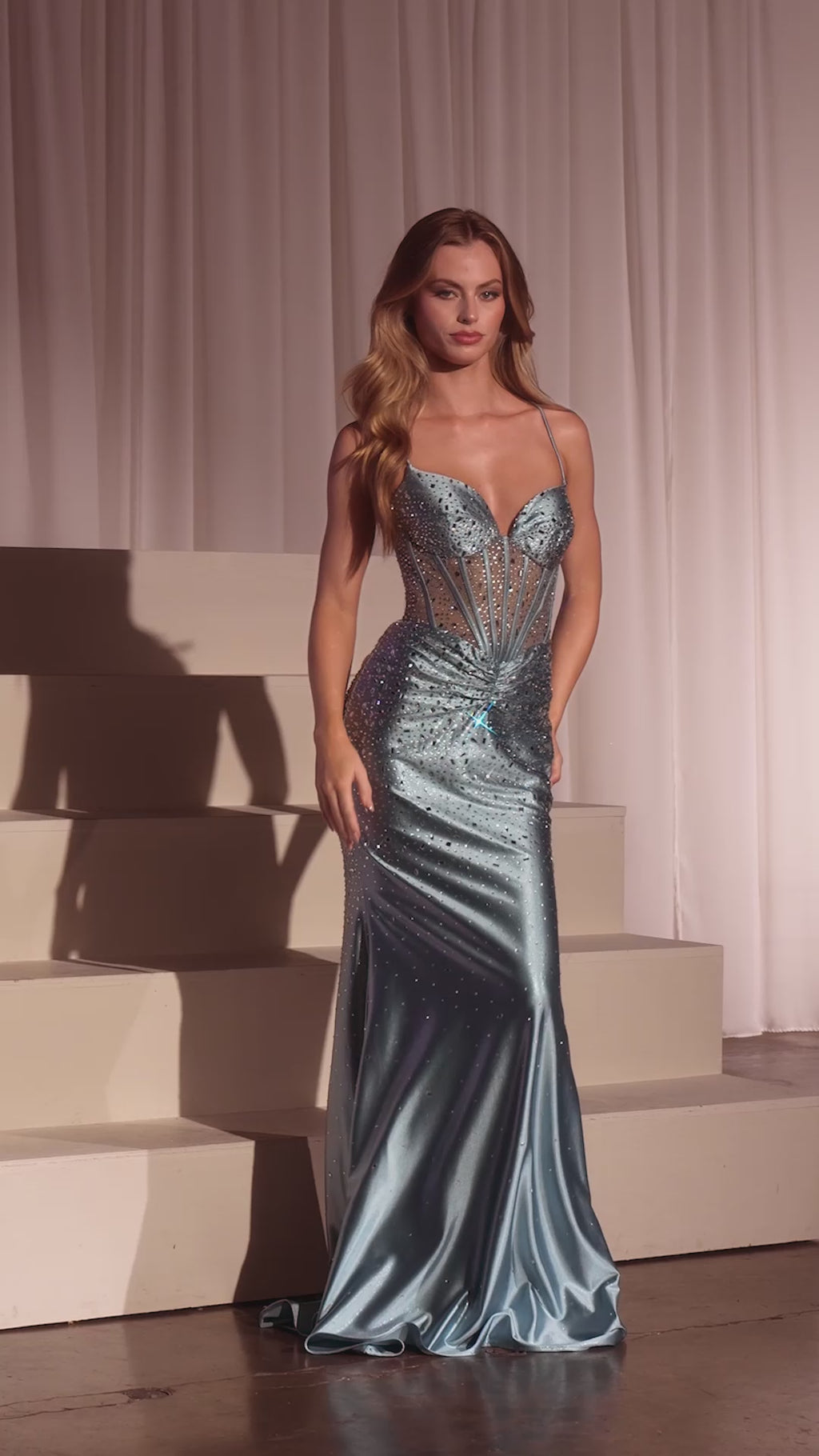 Turn heads with this breathtaking fitted gown, designed to enhance your elegance and confidence. The sweetheart neckline and delicate thin straps create a refined, feminine look, while shimmering crystal embellishments adorn the stretch satin fabric, contouring your silhouette beautifully. The open lace-up corset back adds a modern, sultry twist, ensuring a perfect fit and a touch of allure. Ideal for prom or any formal event, this gown promises an unforgettable entrance.