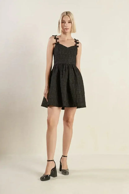 Chic and charming, the Coveted Sweetness Bow Detail Mini Dress in black is your new favorite for date nights, parties, and special occasions. This textured lace mini dress features a classic cami-style bodice with dainty bow details at the straps for a flirty, feminine touch. The full skirt adds playful volume, while the back zipper closure ensures a sleek, secure fit.
