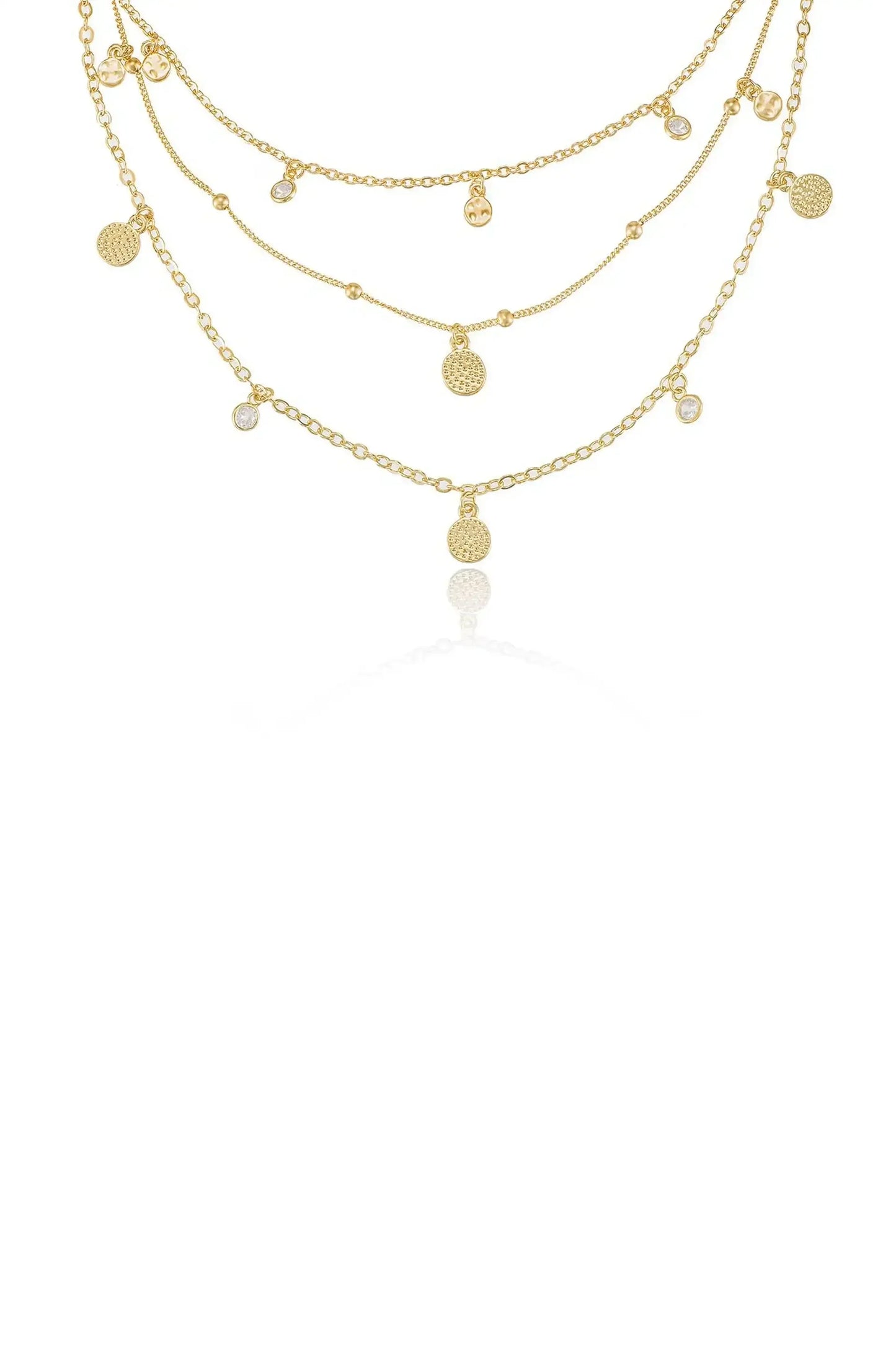 A three-tiered gold necklace featuring multiple delicate chains, adorned with small circular and sparkling charms. It appears elegant and ready for wear, set against a plain white background.