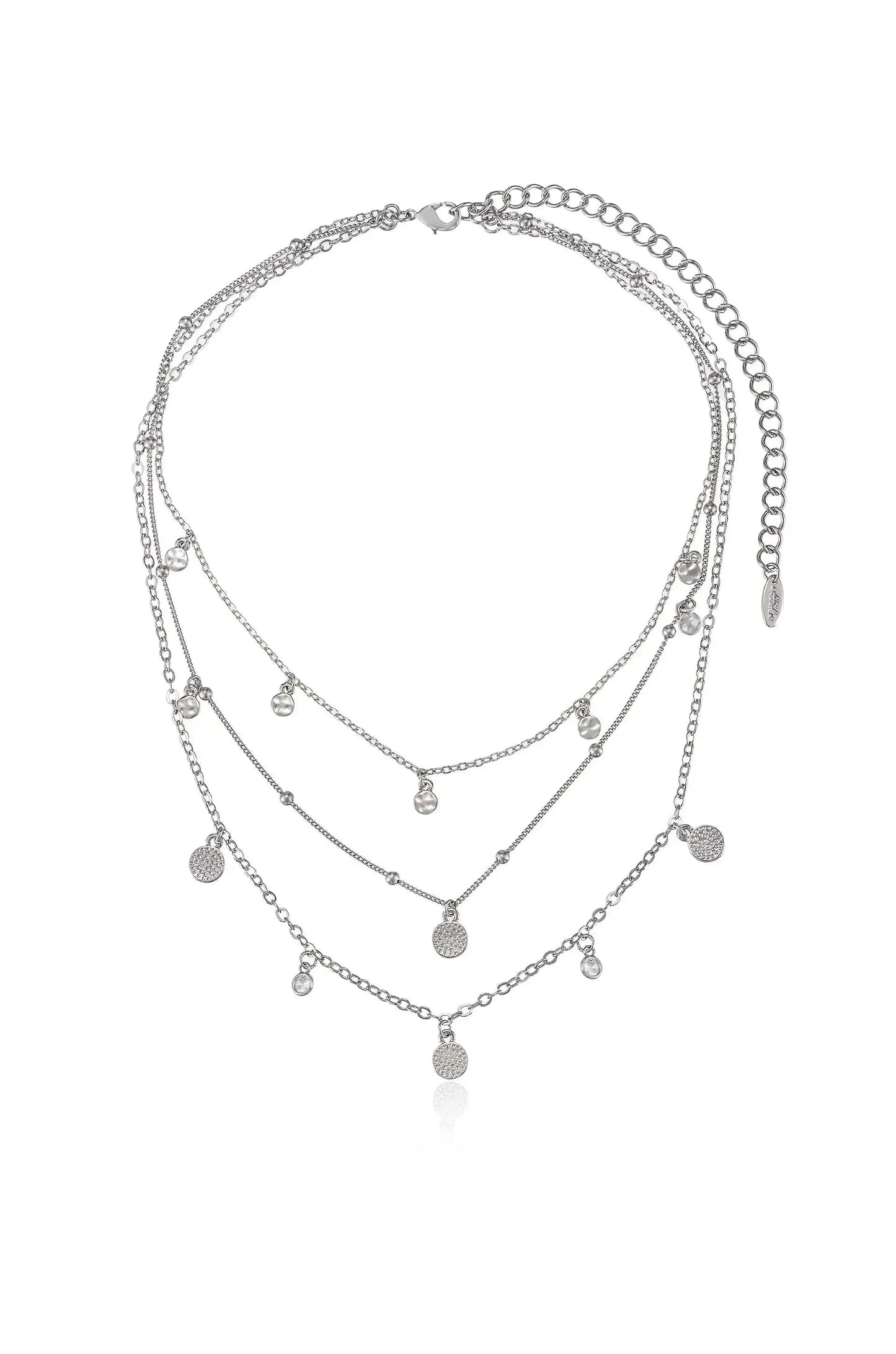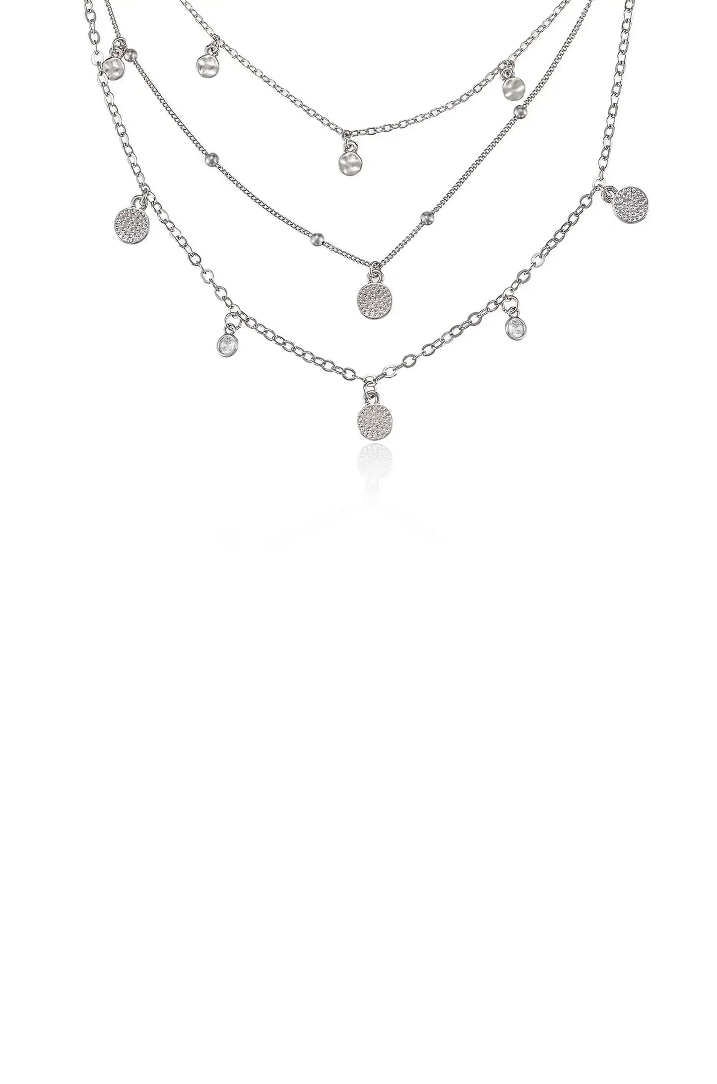 A silver necklace with multiple layered chains features various small pendants, including textured circles and clear beads, displayed against a white background.