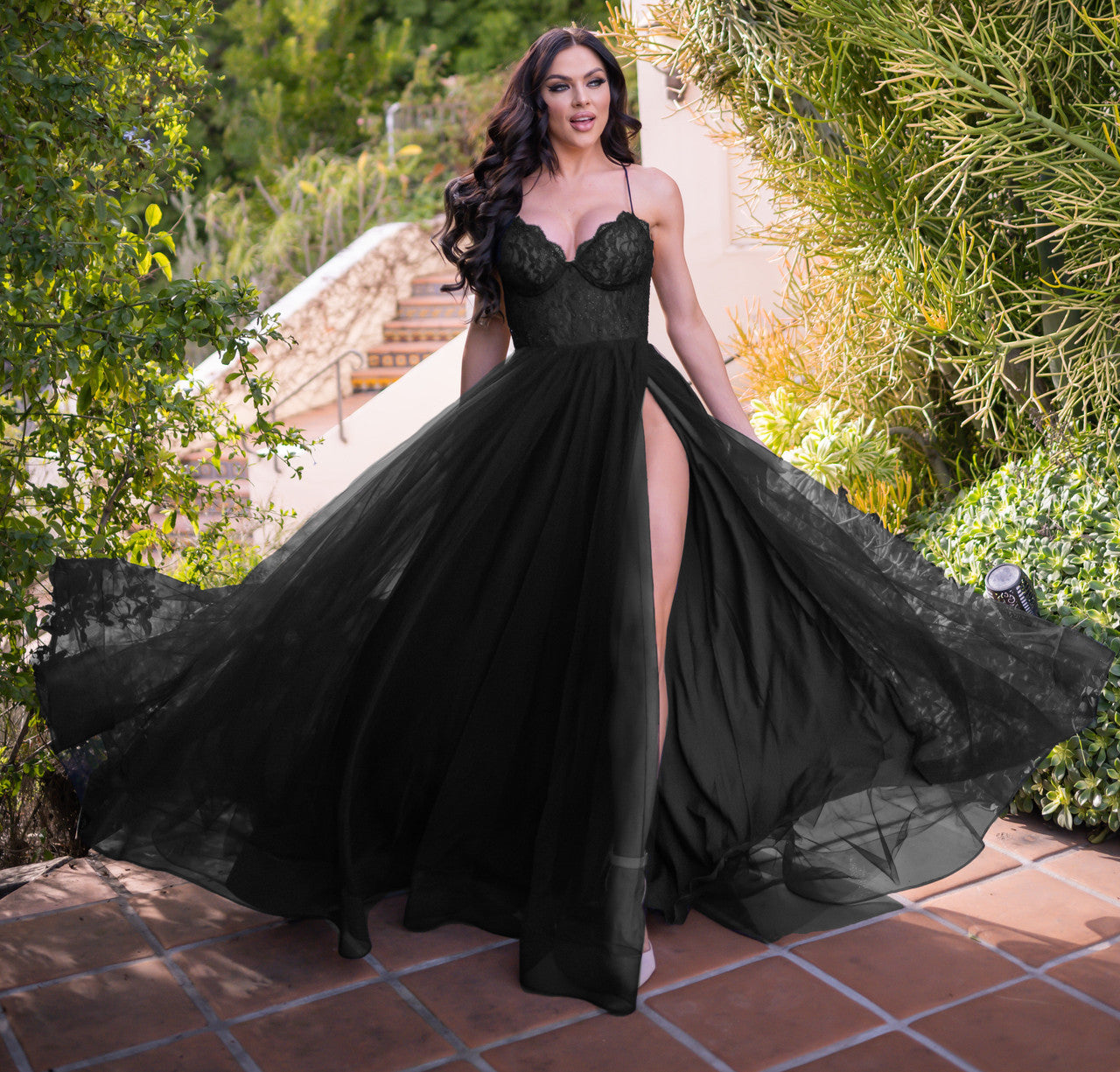 The Dani Gown in Black is an unforgettable statement of elegance and allure. This floor-length A-line gown features a sheer bralette-style bodice adorned with delicate tonal crystals and scalloped eyelash lace along the neckline for a soft, romantic finish. The adjustable lace-up open back adds a sultry touch while offering a customizable fit.