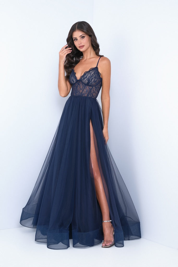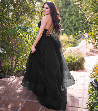 Crafted from airy layers of tulle, the skirt flows beautifully with a flattering side leg slit and subtle sweep train for graceful movement. Finished with a hidden zipper closure beneath the lace-up detail, this gown blends structure and fluidity for an effortlessly glamorous silhouette.