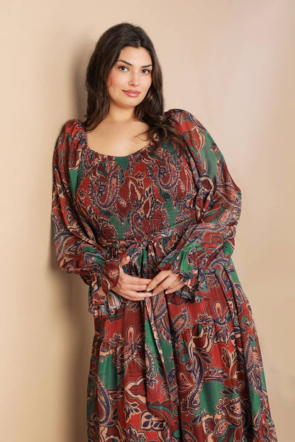 The tiered full-length skirt flows with soft movement, while the smocked back bodice ensures a flexible, flattering fit across bust and waist, perfect for brunches, garden parties, or easy weekend elegance.