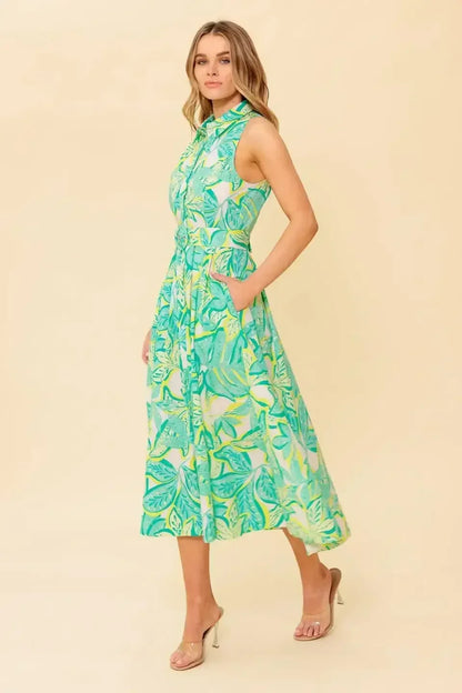 Effortless style for every day. This dress is made for any occasion, whether it's a casual lunch or a special event. It's designed with a flattering collar and a button down front, and features a self belt for a customizable fit. With a sleeveless design, it's perfect for every season.