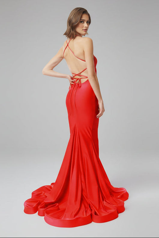 The Delaney Gown is a fabulously fitted dress with a sexy high neck halter creating a long, lean silhouette from head to toe. The back of this dress features an open, lace up back detail; perfect for adjustability!