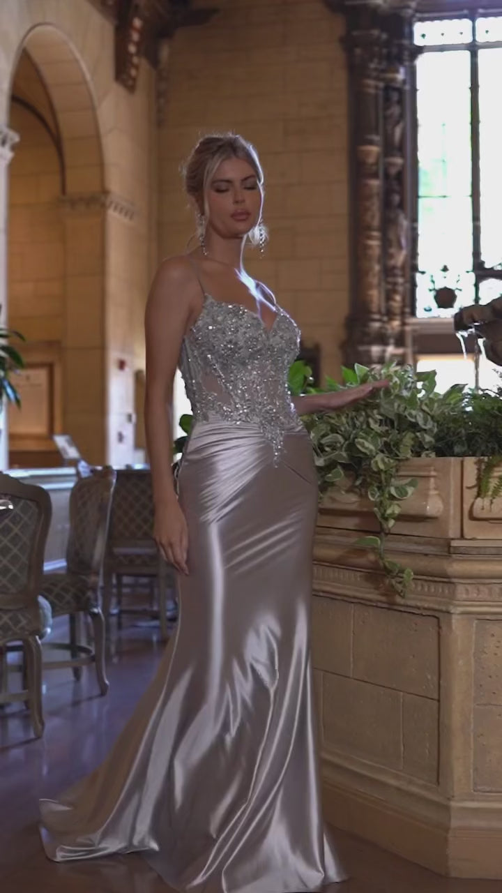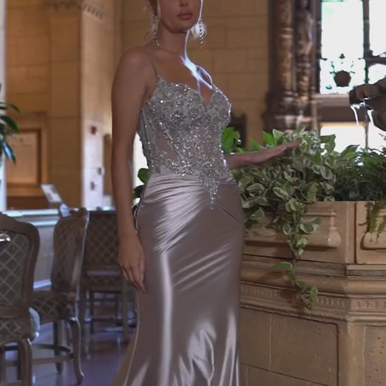 Della Gown - Silver - FITTED SATIN & LACE EMBELLISHED GOWN
