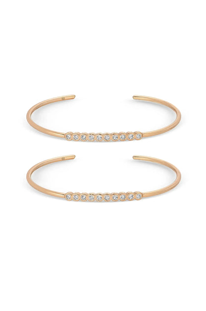 Two thin, open-ended bracelets are displayed side by side. The upper bracelet features a row of small, sparkling stones, while the lower one showcases a similar design with more stones, both set in a gold-tone metal.