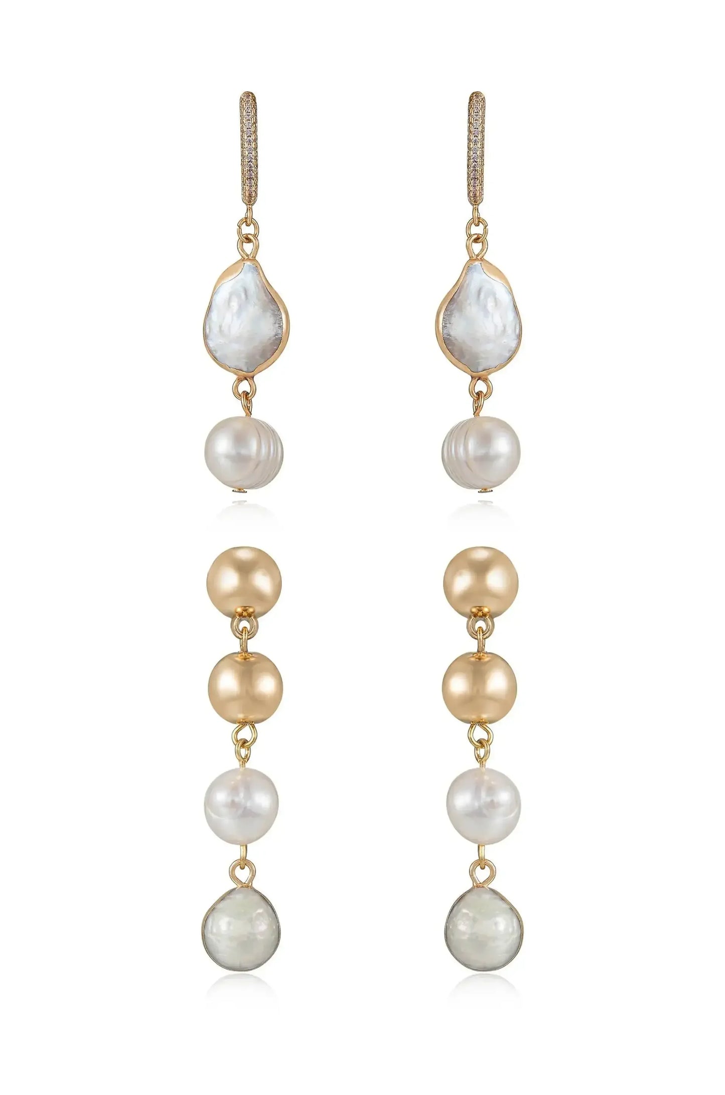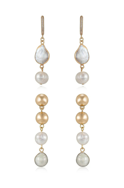 Two pairs of elegant drop earrings hang vertically, featuring a mix of gold-tone metal and various pearls, including white, cream, and gray. The design showcases a sophisticated, layered look.