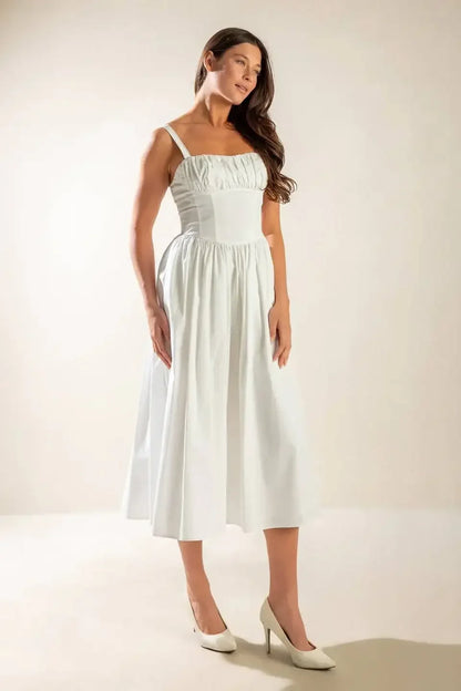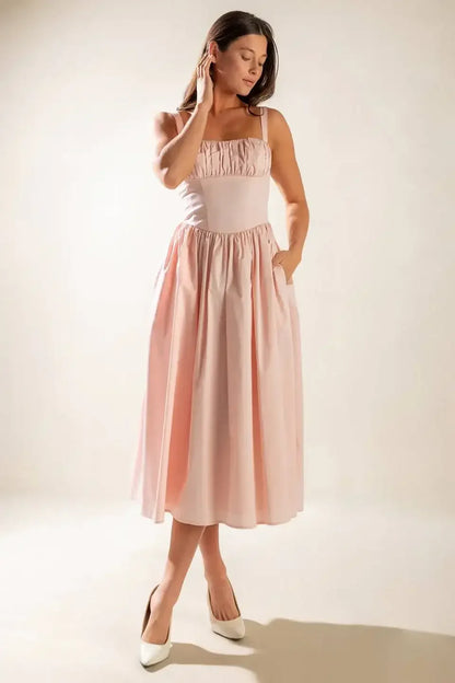 This midi dress is designed to flatter with a bustier top and ruched details. The straight neckline and straps provide support, while the full skirt and side pockets add functionality. Perfect for any occasion, this dress will become a staple in your wardrobe, easily loved by all.