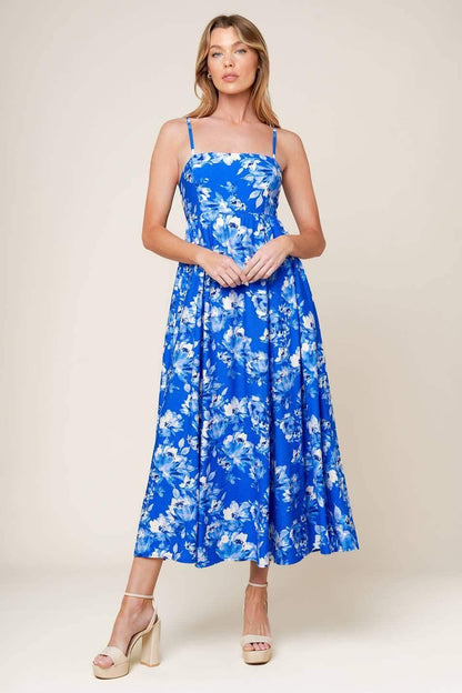 A charming printed woven midi dress inspired by classic English garden blooms. This dress features a straight neckline with slender straps, a flowing full skirt, and an adjustable back tie with an elasticized back for a comfortable fit. Perfect for garden parties, brunches, or casual outings, the English Garden dress brings timeless floral elegance to your wardrobe.