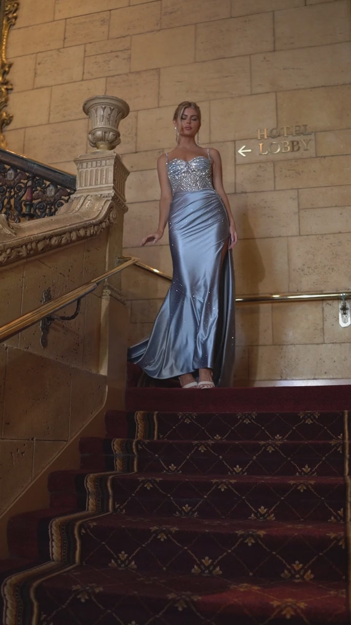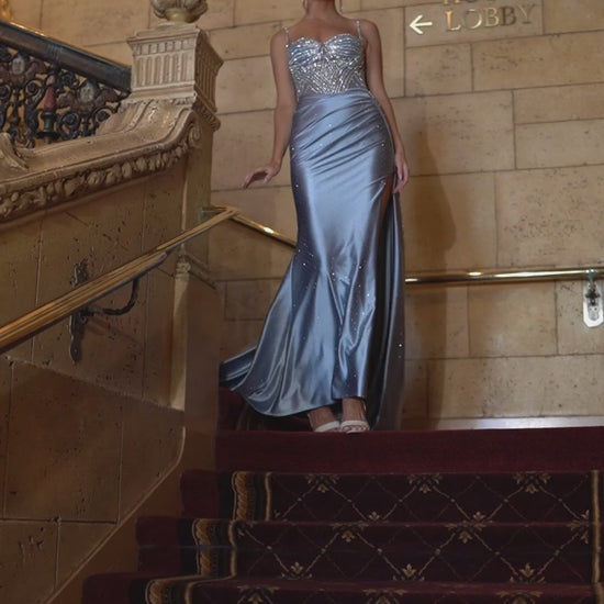 This fitted dress radiates timeless glamour with a flattering sweetheart neckline and thin straps, complemented by a beautifully beaded bodice that sparkles with sophistication. The side sash and leg slit elevate its elegant design, while the soft stretch satin ensures a comfortable, body-contouring fit. Perfect for black-tie events, galas, or formal occasions like prom, this gown is the epitome of refined elegance.