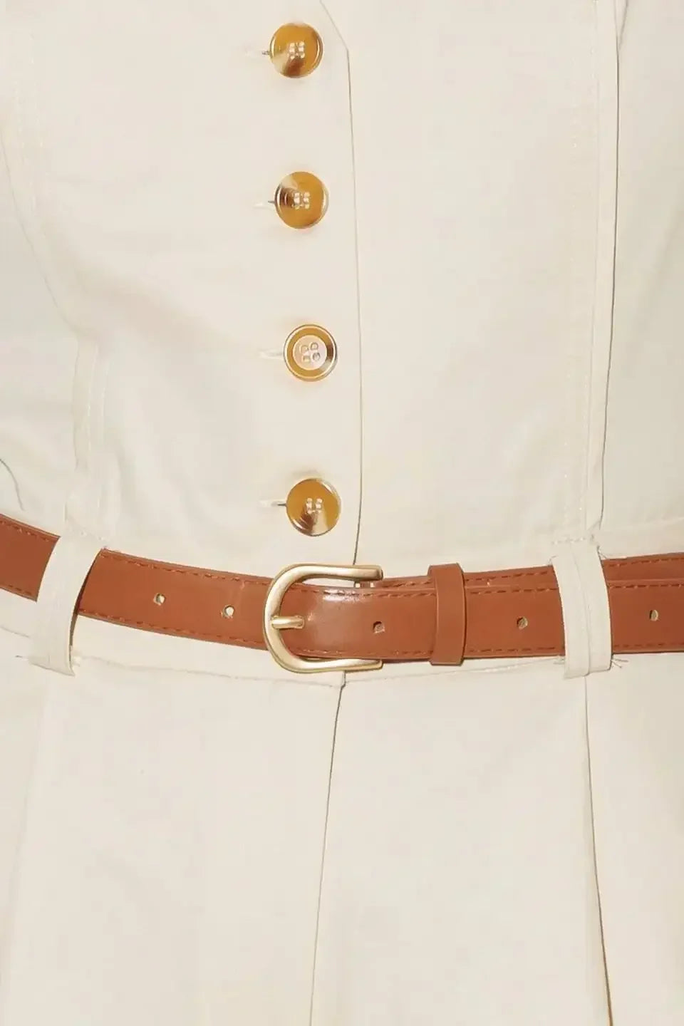 Effortlessly stylish, the Everyday Essential Woven Jumpsuit in almond is your go-to one-and-done outfit for polished comfort. Crafted from 100% cotton, this breathable piece features a flattering V neckline, sleeveless bodice, and functional front button and zipper closure. A removable belt cinches the waist, while wide-leg pants and side pockets add a relaxed yet put-together vibe. The surplice back with a subtle cutout detail offers an unexpected, modern twist—perfect for casual days, weekend outings, or travel looks.