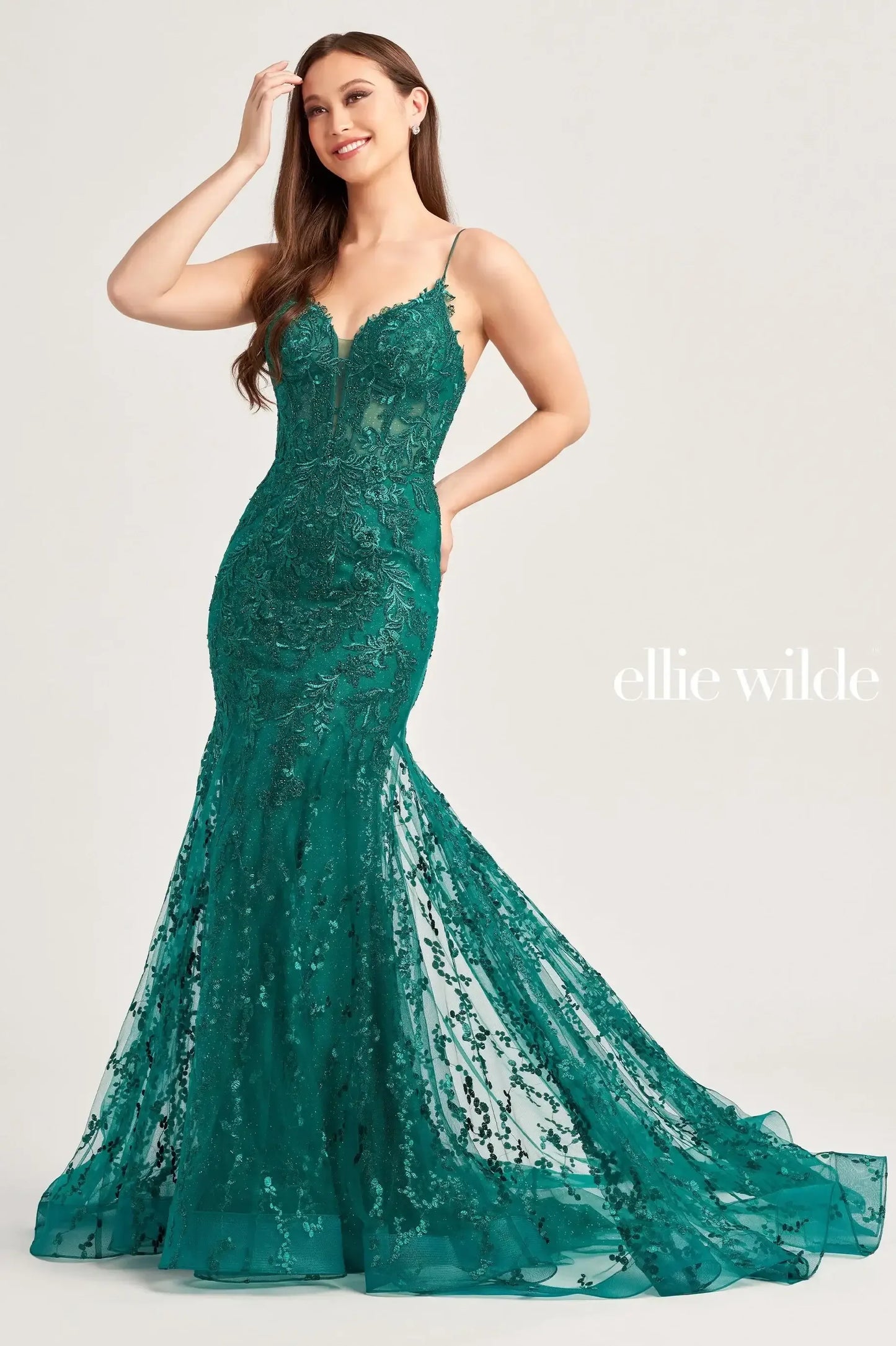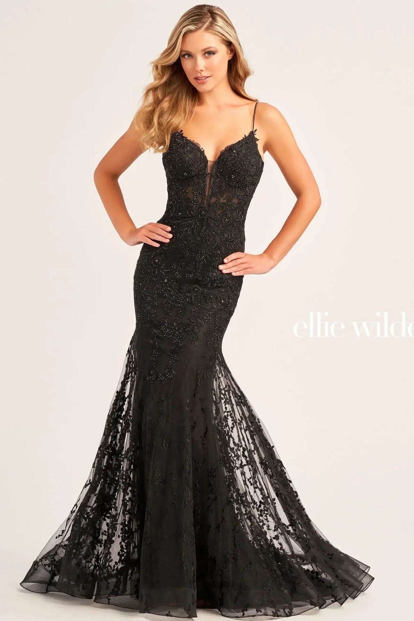 Illuminate the night in the enchanting Ellie Wilde dress EW35010. This embroidered tulle prom dress is a stunning blend of romance and glamour, designed to make you shine. The graceful trumpet silhouette hugs your curves, creating a timeless and captivating shape. The sweetheart neckline adds a feminine touch, while the exquisite embroidery, sparkling glitter tulle, and shimmering stone accents elevate the dress with a magical, sophisticated appeal. Perfect for your most special occasions, this Ellie Wilde creation ensures you’ll turn heads and leave a lasting impression wherever you go.