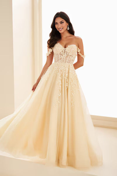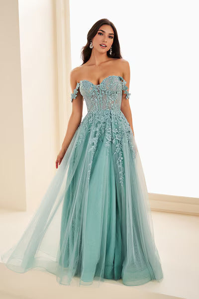 Make an unforgettable entrance in the EW35101 by Ellie Wilde, a glittering A-line gown designed to balance romance with modern flair. Crafted from shimmering glitter tulle, this dress is adorned with floral lace appliqués that add texture and dimension throughout. The off-the-shoulder three-dimensional flower lace straps frame a flattering sweetheart neckline, creating a soft, feminine look with standout detail. A subtle leg slit completes the design, adding movement and a touch of allure.