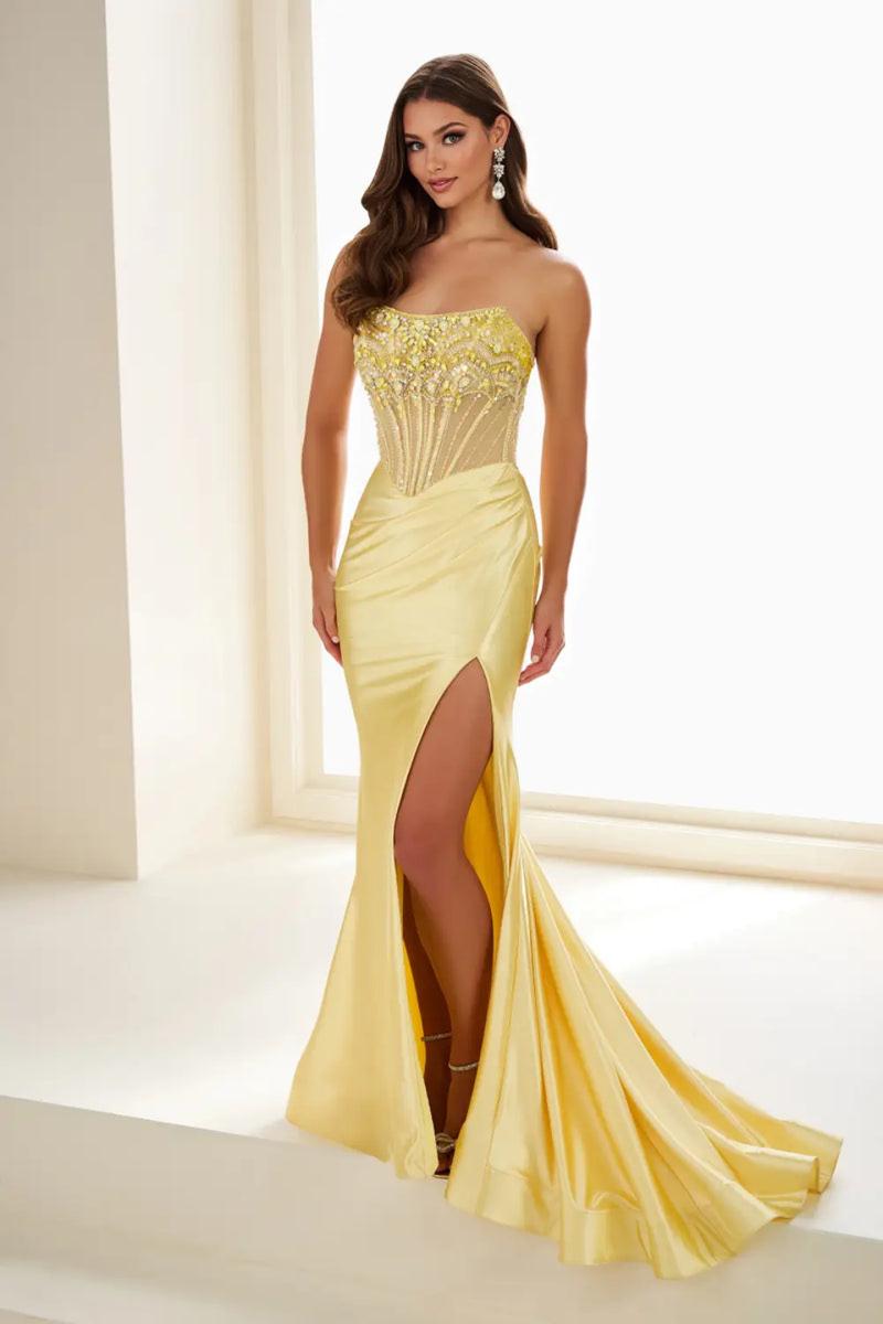 The corset bodice and lace-up back provide an adjustable, flawless fit, while delicate beading and sparkling stone accents add glamorous detail. For versatility, optional spaghetti straps are included, allowing you to customize your look. Perfect for prom, black-tie events, galas, and formal occasions, this gown combines elegance, sophistication, and unforgettable style.