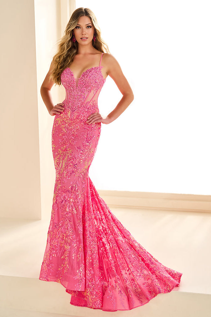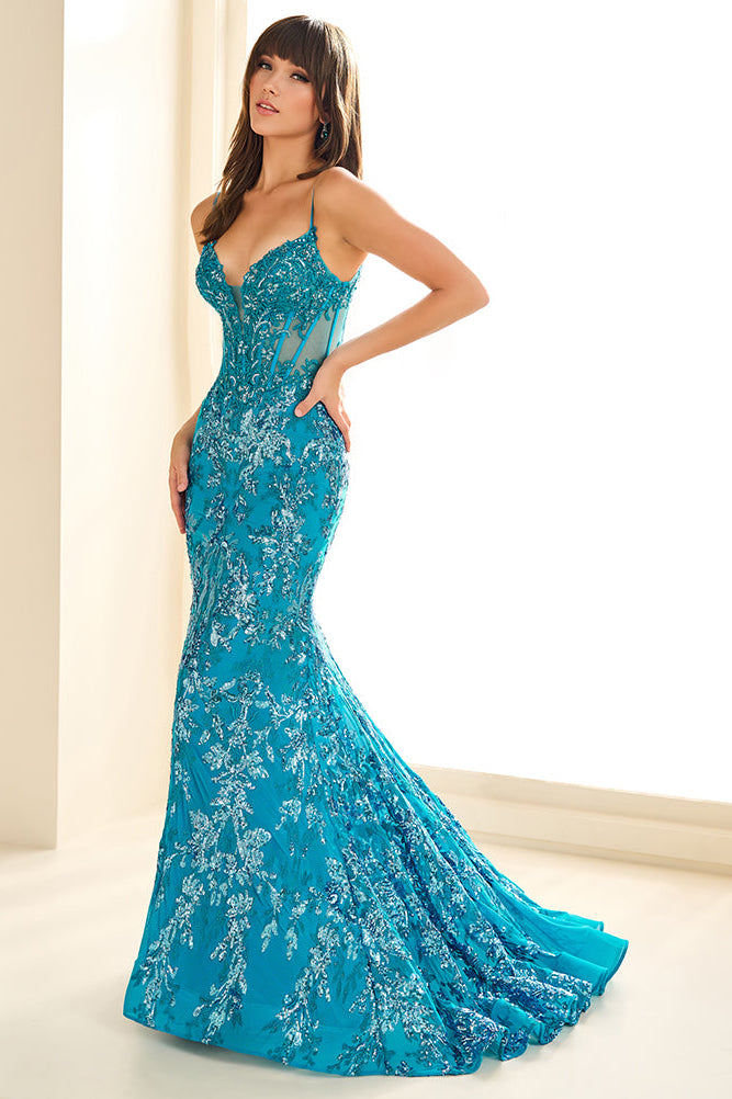 Step into the spotlight and captivate the room in the mesmerizing Ellie Wilde dress EW36003. This extraordinary mermaid gown is a true masterpiece, crafted from embroidered sequin mesh and adorned with delicate lace appliqués, ensuring a look of timeless elegance. The sweetheart neckline beautifully enhances the sleeveless corset bodice, offering a flattering and structured fit that exudes sophistication. The daring cut-out back adds a touch of allure, while the dropped waistline effortlessly accentuates your silhouette. Perfect for any romantic occasion, this dress guarantees you’ll leave a lasting impression.