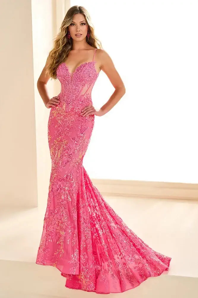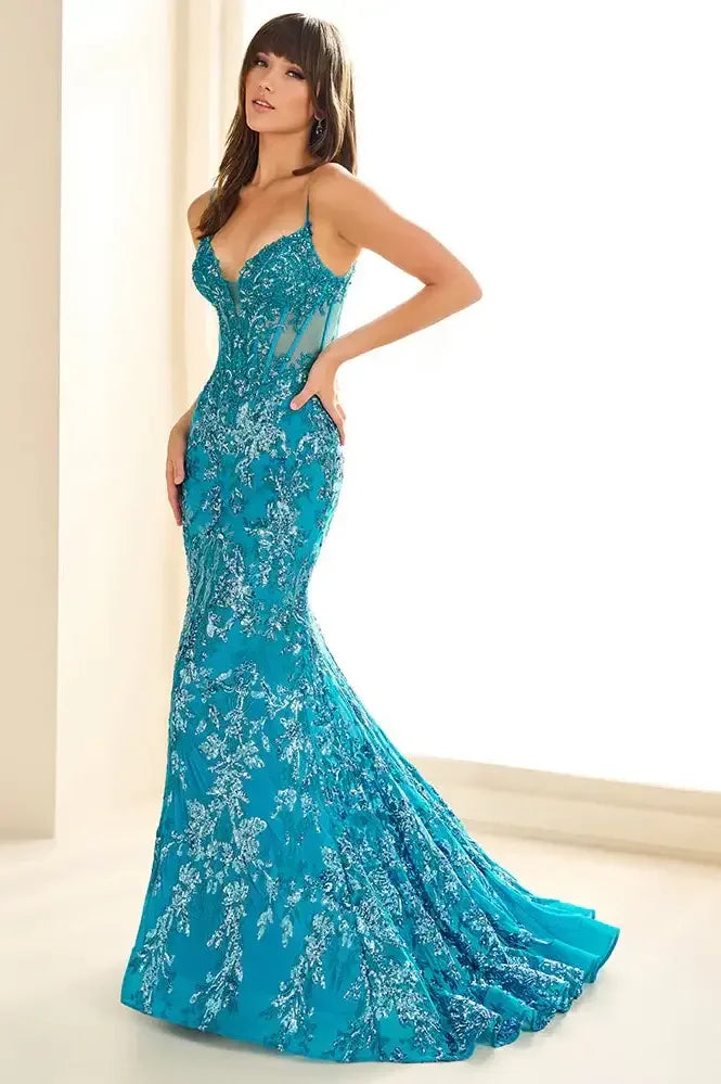 Step into the spotlight and captivate the room in the mesmerizing Ellie Wilde dress EW36003. This extraordinary mermaid gown is a true masterpiece, crafted from embroidered sequin mesh and adorned with delicate lace appliqués, ensuring a look of timeless elegance. The sweetheart neckline beautifully enhances the sleeveless corset bodice, offering a flattering and structured fit that exudes sophistication. The daring cut-out back adds a touch of allure, while the dropped waistline effortlessly accentuates your silhouette. Perfect for any romantic occasion, this dress guarantees you’ll leave a lasting impression.