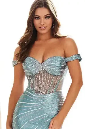 The sweetheart neckline beautifully frames the décolletage, while romantic off-the-shoulder sleeves enhance its feminine charm. Designed with a corset bodice for a figure-flattering fit and a dropped waistline that elongates your silhouette, this gown is pure sophistication. A daring slit adds a modern twist, making every step a statement of confidence and grace.