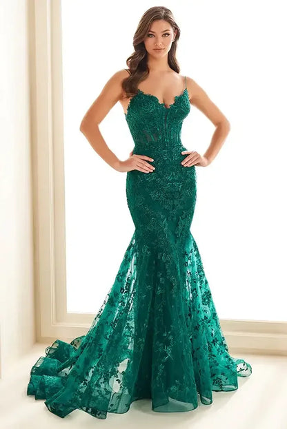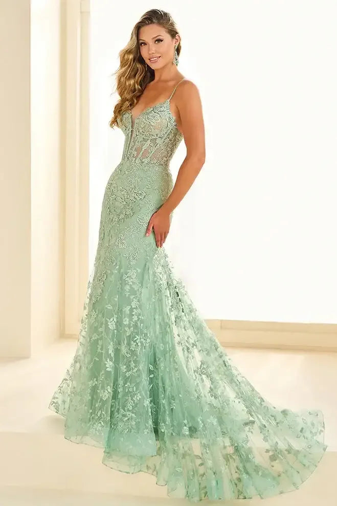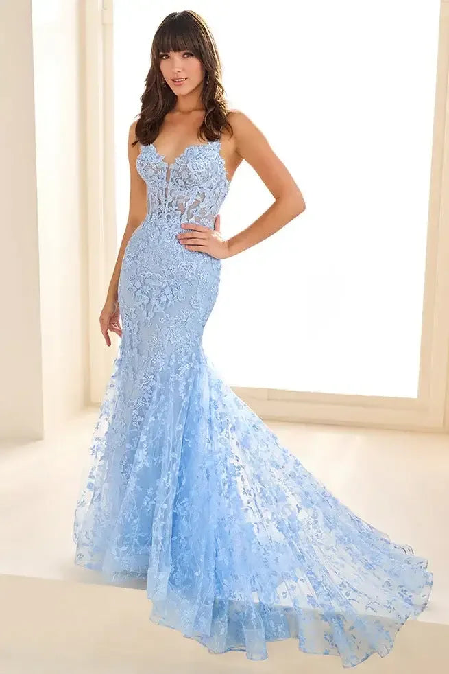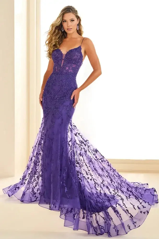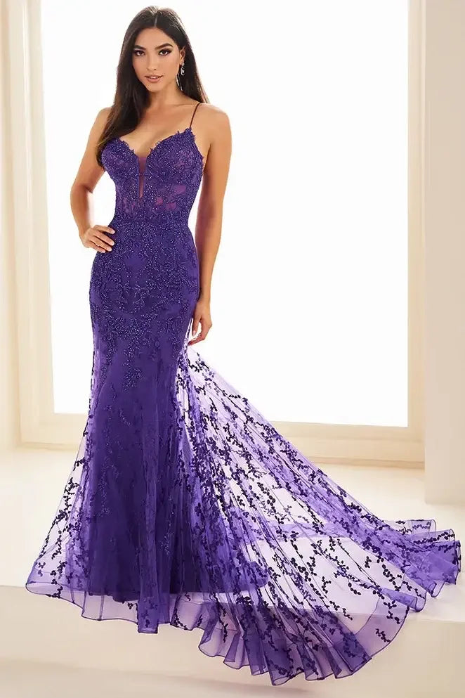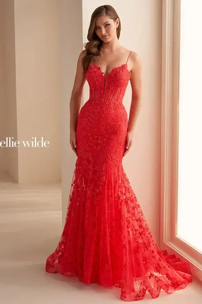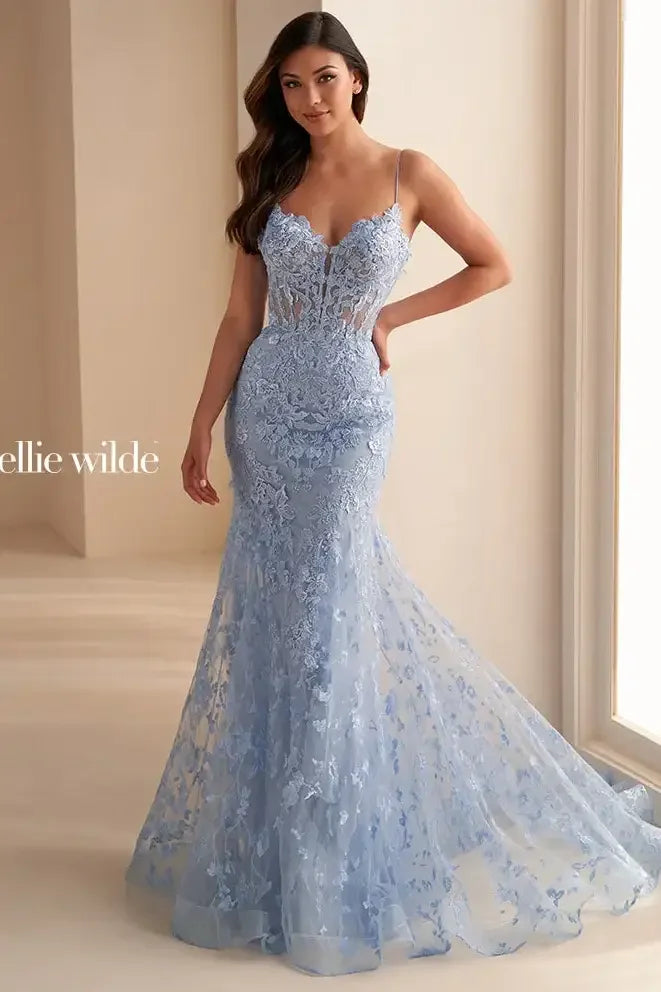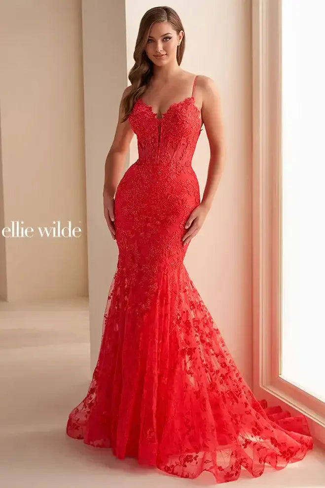 Step into the spotlight and captivate the room in the mesmerizing Ellie Wilde dress EW36008. This extraordinary long romantic gown is a true masterpiece, crafted from embroidered mesh and glitter tulle, adorned with exquisite stone accents that shimmer with every movement, ensuring you're the center of attention. The dress features a timeless sweetheart neckline that beautifully frames the décolletage, while the corset bodice with a lace-up back adds a touch of allure and ensures a perfect fit. The fit-and-flare silhouette gracefully flatters your figure, and the natural waistline enhances your curves, creating a breathtaking look for unforgettable moments.