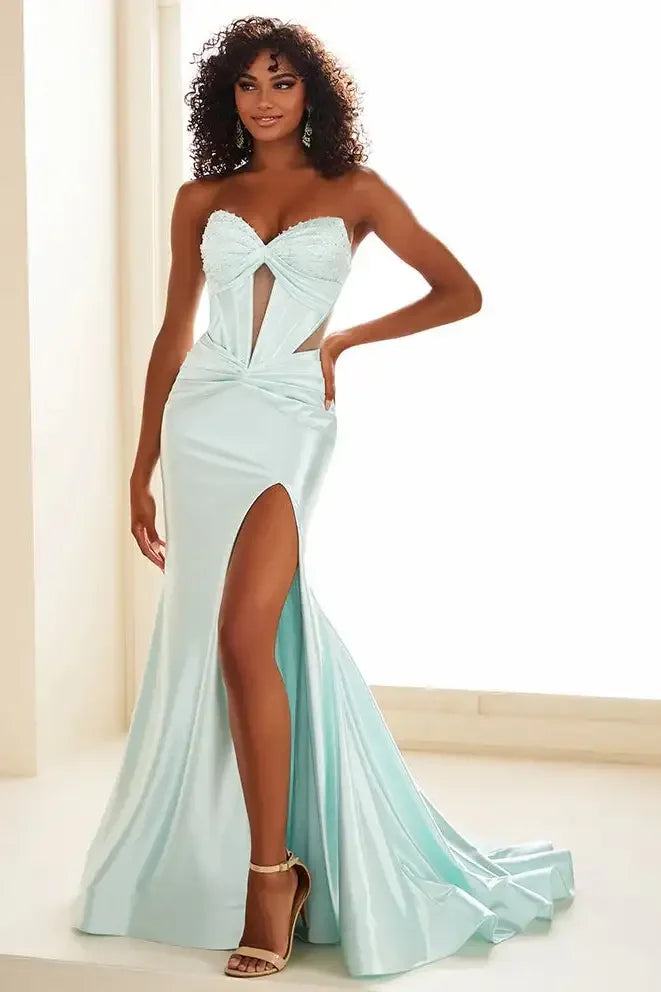 Make a grand entrance and steal the show in the breathtaking Ellie Wilde dress EW36009. This exquisite mermaid gown is crafted from premium stretch knit, featuring detailed beadwork and dazzling stone embellishments that shimmer with every movement. The strapless sweetheart neckline highlights your curves, while the corset bodice ensures a flattering, figure-hugging fit. A striking lace-up back brings an element of drama, and the detachable spaghetti straps offer styling versatility. The dropped waistline and sophisticated slit complete this show-stopping look, making it an ideal choice for unforgettable events.