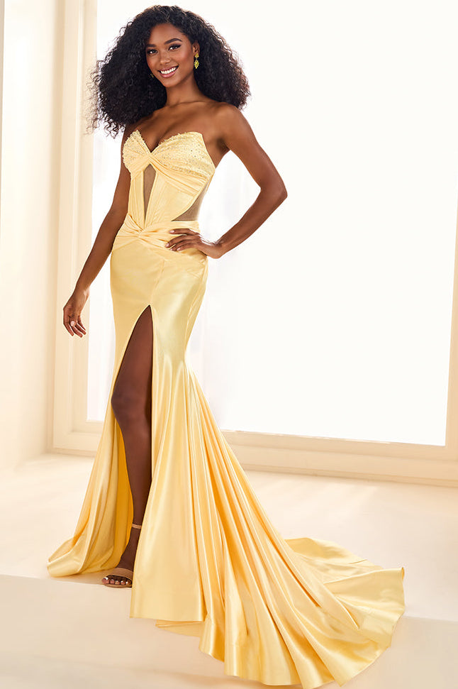Make a grand entrance and steal the show in the breathtaking Ellie Wilde dress EW36009. This exquisite mermaid gown is crafted from premium stretch knit, featuring detailed beadwork and dazzling stone embellishments that shimmer with every movement. The strapless sweetheart neckline highlights your curves, while the corset bodice ensures a flattering, figure-hugging fit. A striking lace-up back brings an element of drama, and the detachable spaghetti straps offer styling versatility. The dropped waistline and sophisticated slit complete this show-stopping look, making it an ideal choice for unforgettable events.
