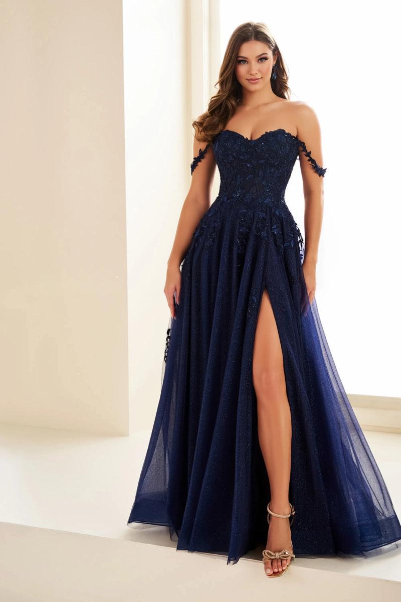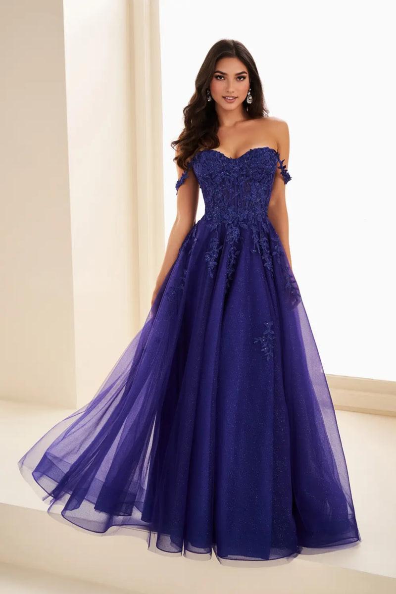 Playful elegance meets modern design in the EW36083 by Ellie Wilde, a standout A-line gown perfect for prom or homecoming. The flattering sweetheart neckline pairs beautifully with a structured corset bodice to create a supportive, sculpted fit. Crafted from shimmering glitter tulle, this gown catches the light with every step. Off-the-shoulder straps add a romantic touch, while a side slit enhances movement and allure. Thoughtfully designed hidden pockets complete the look with a fun, practical detail.