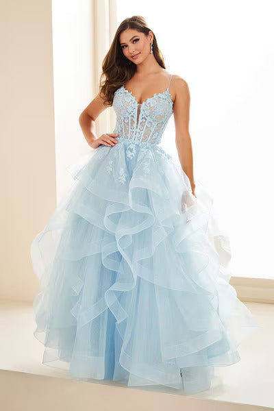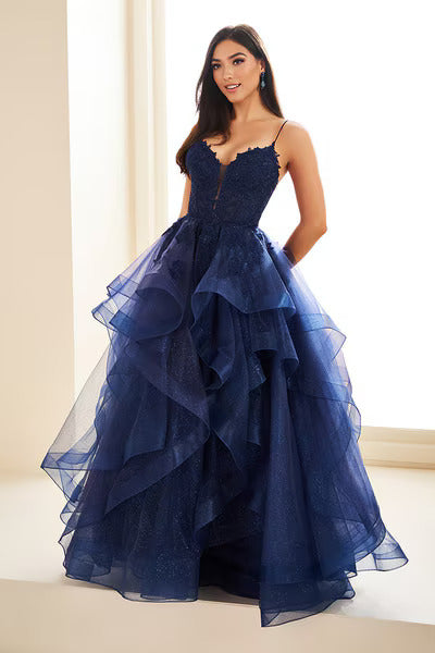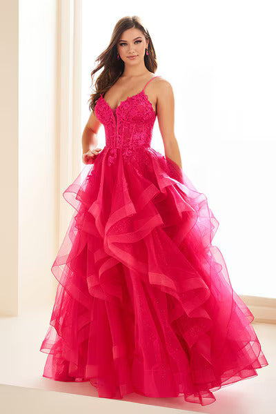 The voluminous skirt is crafted from layers of glitter tulle and adorned with delicate lace appliqués, creating dramatic movement and radiant sparkle with every step. Finished with a lace-up back for a customized, secure fit, this gown is a show-stopping choice for prom and special occasions that call for true glamour.
