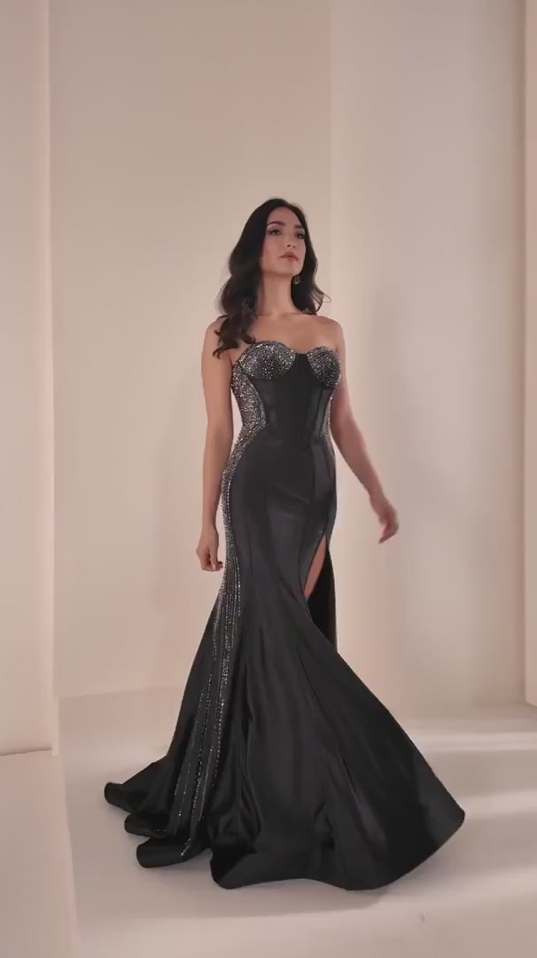 Make a striking entrance in the EW37010 by Ellie Wilde, a glamorous mermaid prom dress designed to turn heads. The structured corset bodice is richly embellished with shimmering stone accents across the bust and cascading down the sides, creating a sculpted, high-impact silhouette.