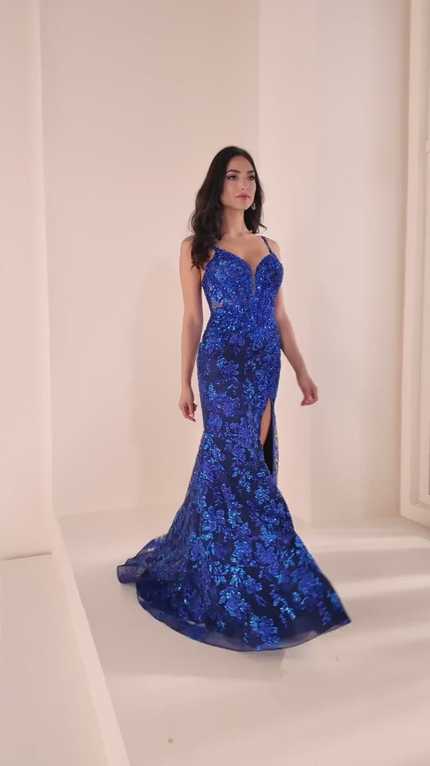 Picture yourself turning heads in this show-stopping mermaid masterpiece from Ellie Wilde. Shimmering tulle adorned with an intricate floral design catches the light with every sequin and stone detail, creating pure magic on the dance floor. The daring plunge neckline paired with a sculpted corset bodice strikes that perfect balance between sultry and sophisticated, while the lace-up back and thigh-high slit ensure you'll own every moment of your special night.