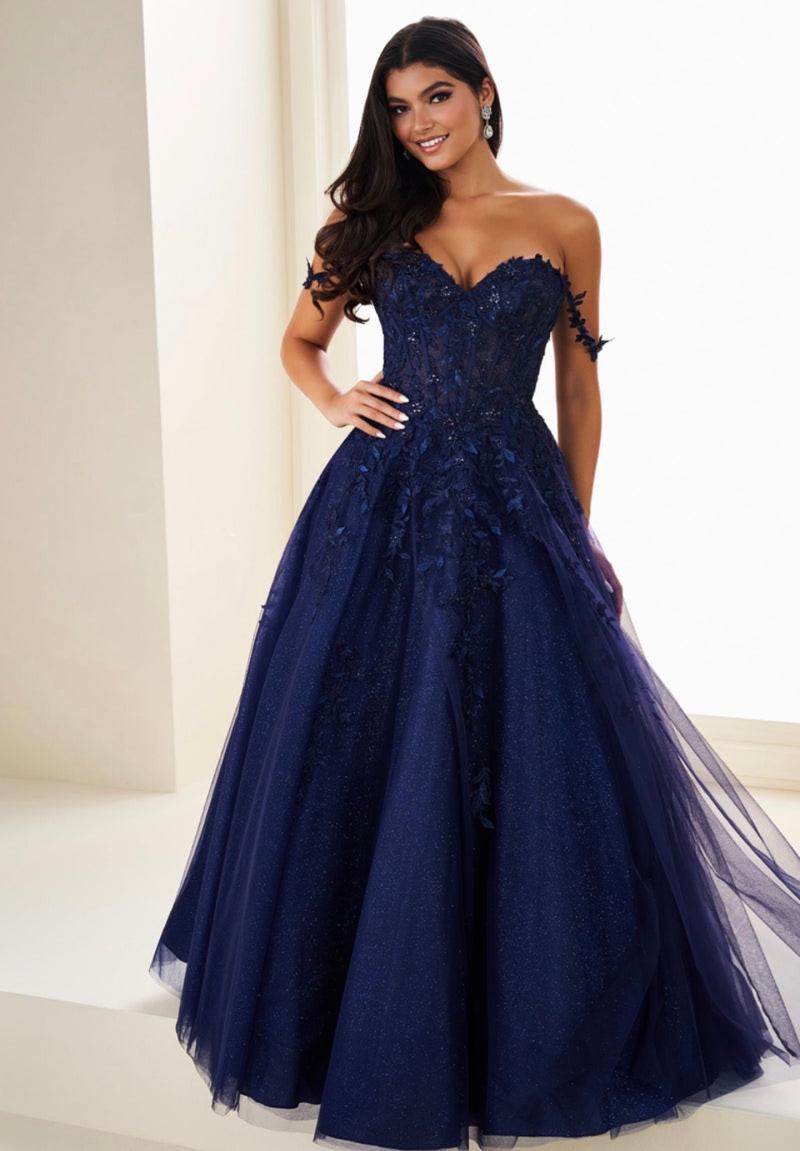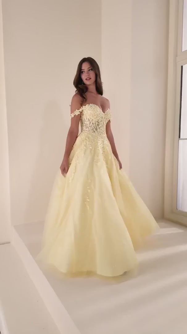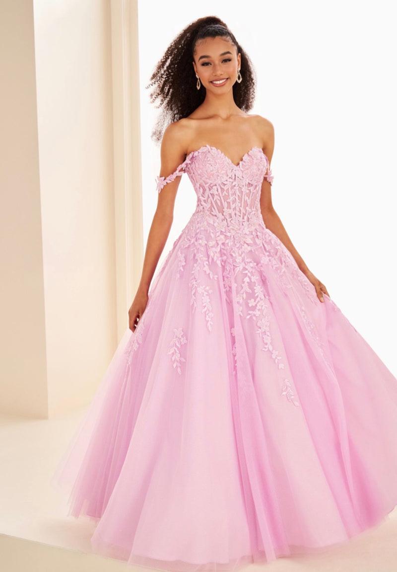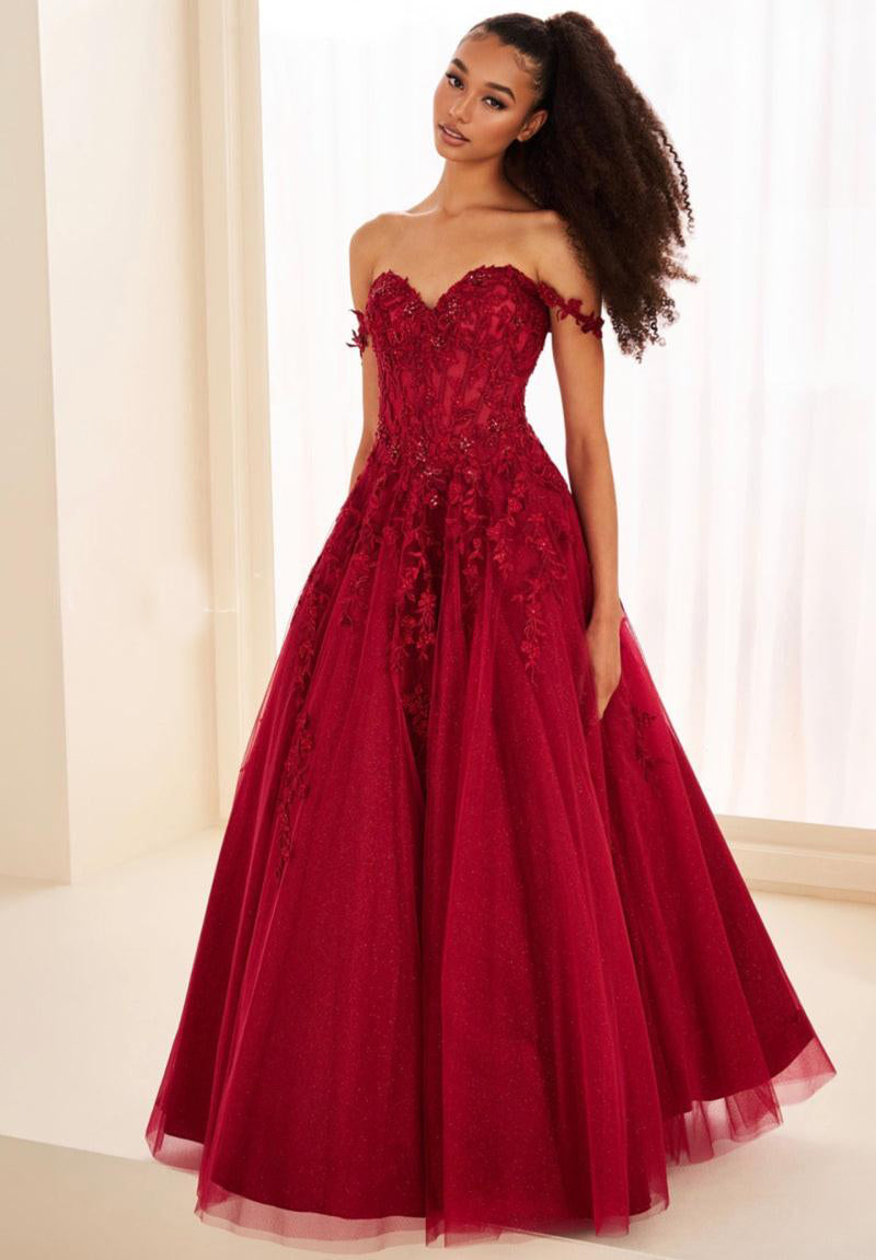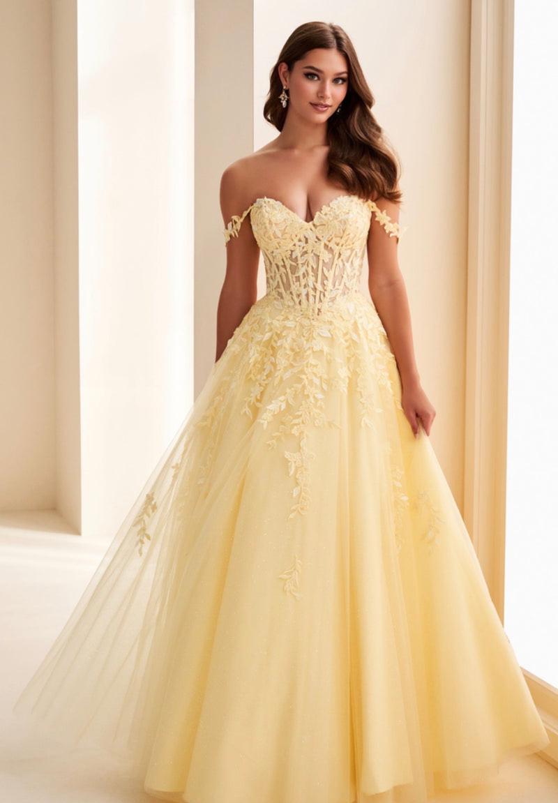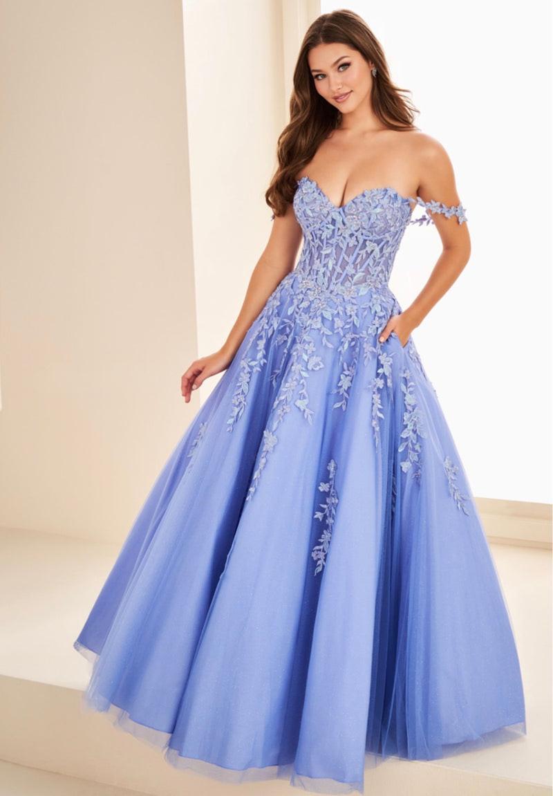 Make an unforgettable entrance in the EW37028 by Ellie Wilde, a show-stopping ball gown designed for dramatic elegance with playful detail. Detachable floral off-the-shoulder straps add a romantic, customizable touch, while the semi-sheer corset bodice sparkles with intricate lace appliqué, sequins, and stone accents for radiant shine. The full skirt brings classic ball gown volume, complemented by hidden pockets for a fun and functional surprise. A lace-up back completes the look with an adjustable, secure fit.
