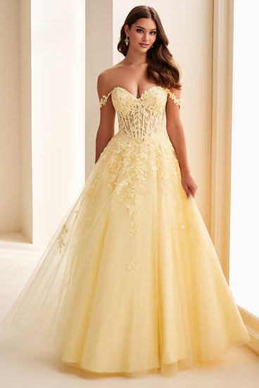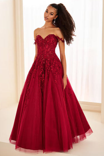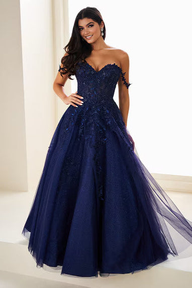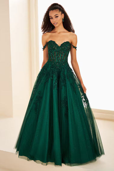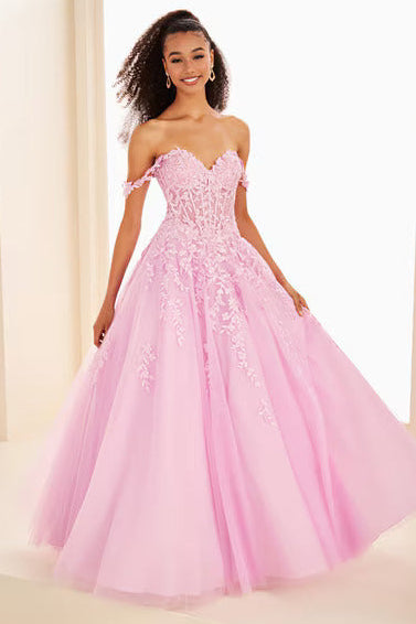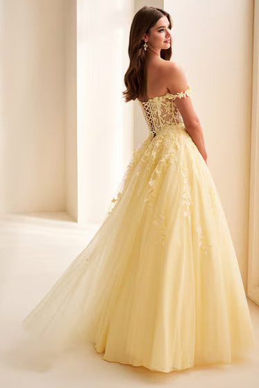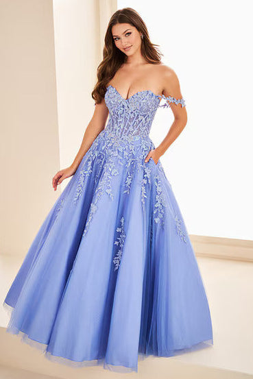 Make an unforgettable entrance in the EW37028 by Ellie Wilde, a show-stopping ball gown designed for dramatic elegance with playful detail. Detachable floral off-the-shoulder straps add a romantic, customizable touch, while the semi-sheer corset bodice sparkles with intricate lace appliqué, sequins, and stone accents for radiant shine. The full skirt brings classic ball gown volume, complemented by hidden pockets for a fun and functional surprise. A lace-up back completes the look with an adjustable, secure fit.
