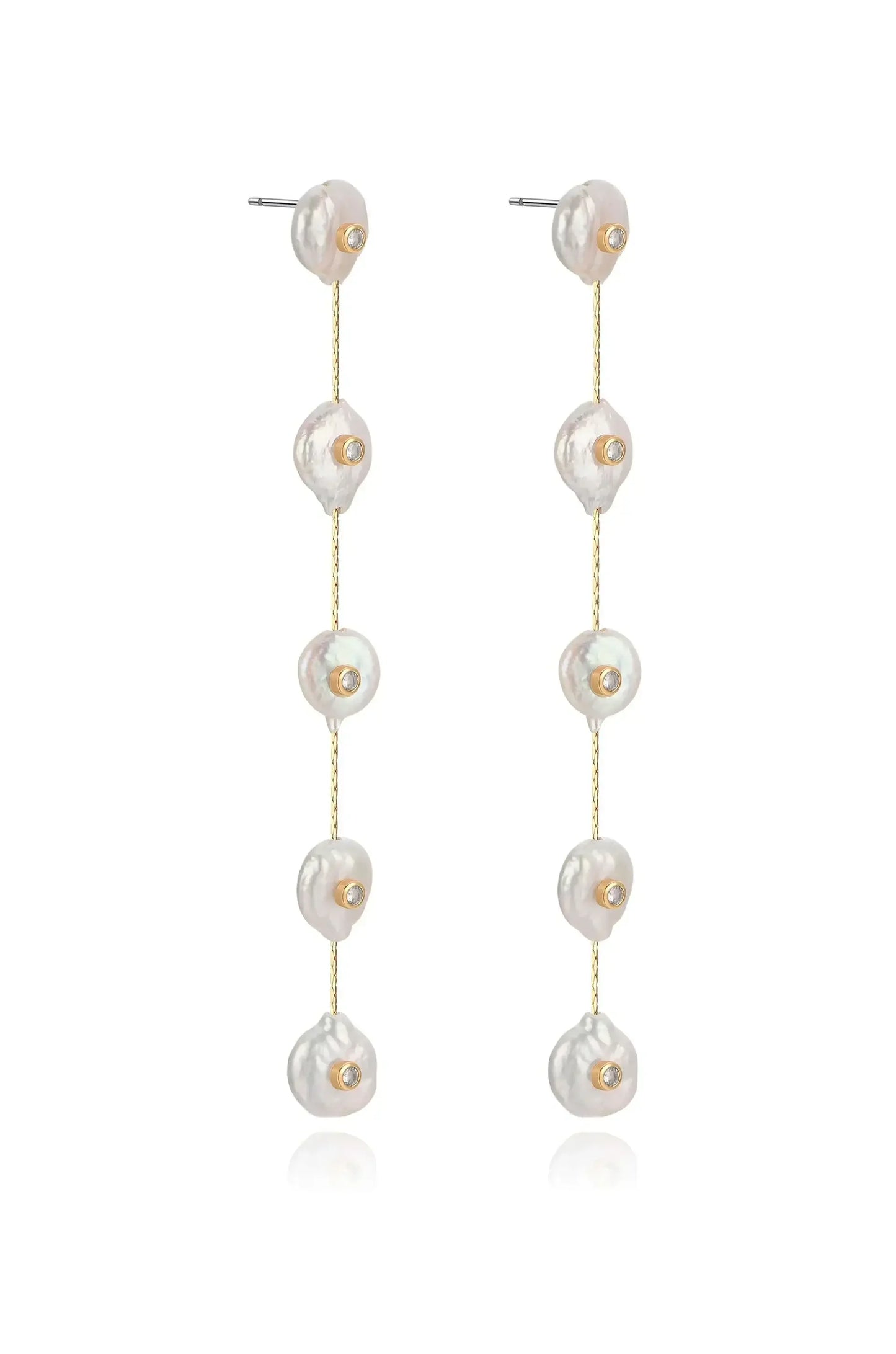 Two long earrings feature irregularly shaped, lustrous pearls spaced along a delicate gold chain, each adorned with a small gemstone, providing an elegant and sophisticated look.