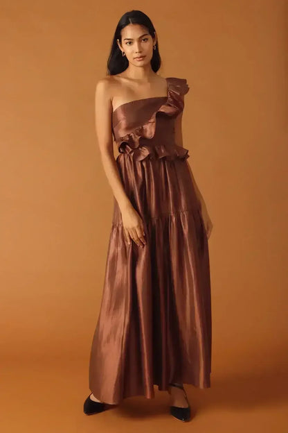 This elegant brown woven maxi dress showcases a straight neckline, a ruffled one-shoulder design, a tiered skirt, and a back zipper closure for a refined and graceful look.