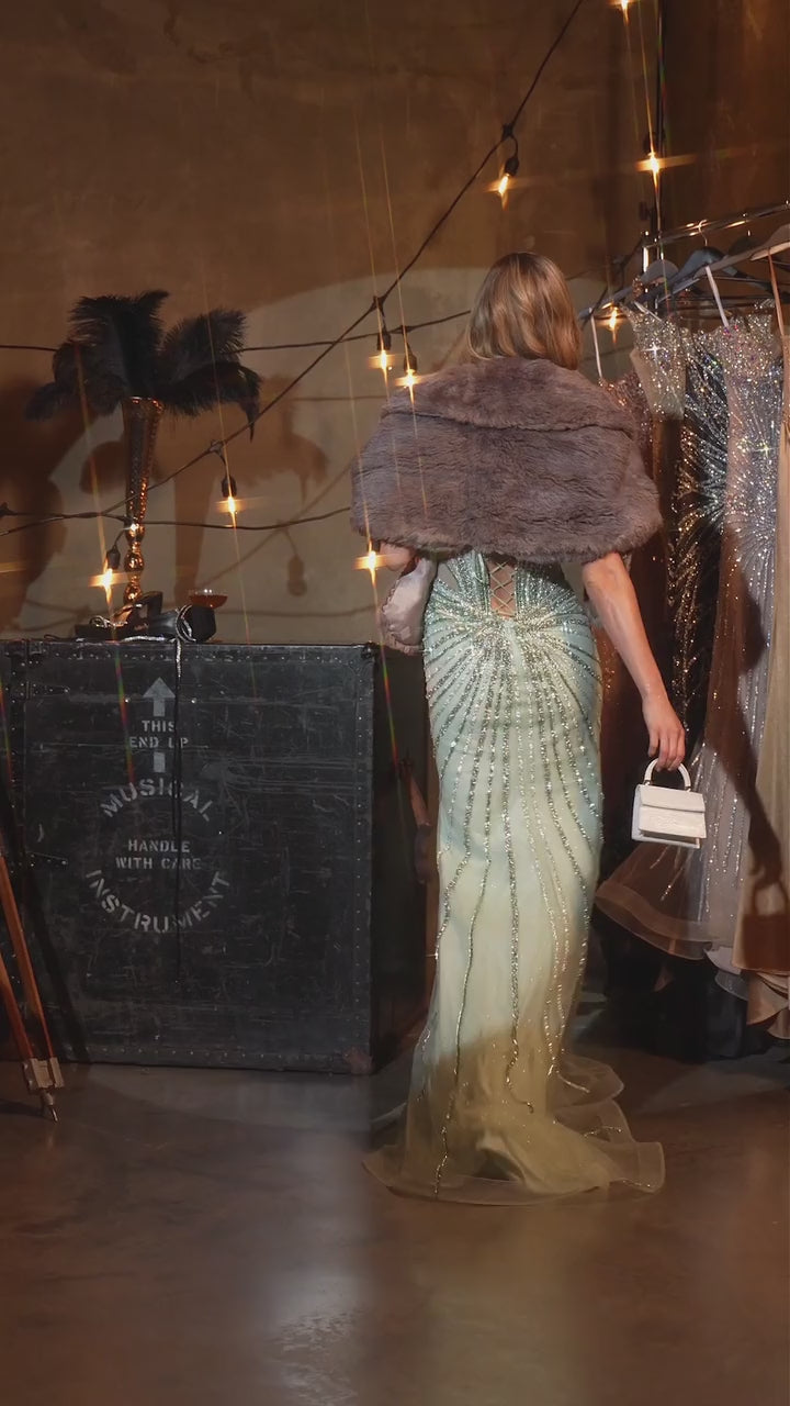 The Frieda Gown radiates sophistication with a fitted silhouette and fully beaded design. A plunging sweetheart neckline meets a sheer illusion corset bodice, accented with swirling linear embellishments that enhance every curve.