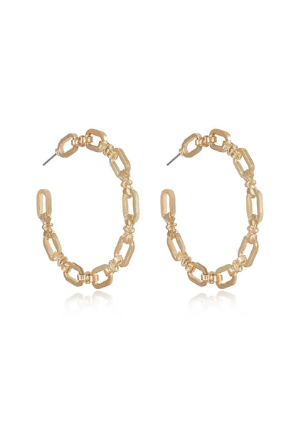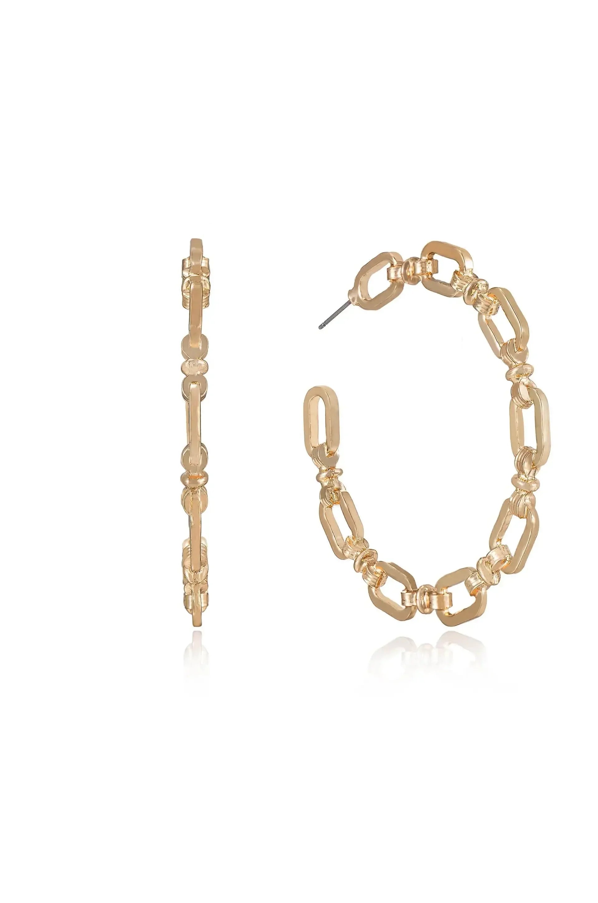 Gold hoop earrings with a linked chain design are displayed prominently. One earring shows a side view while the other reveals a front view, reflecting light against a plain background.