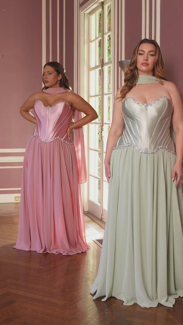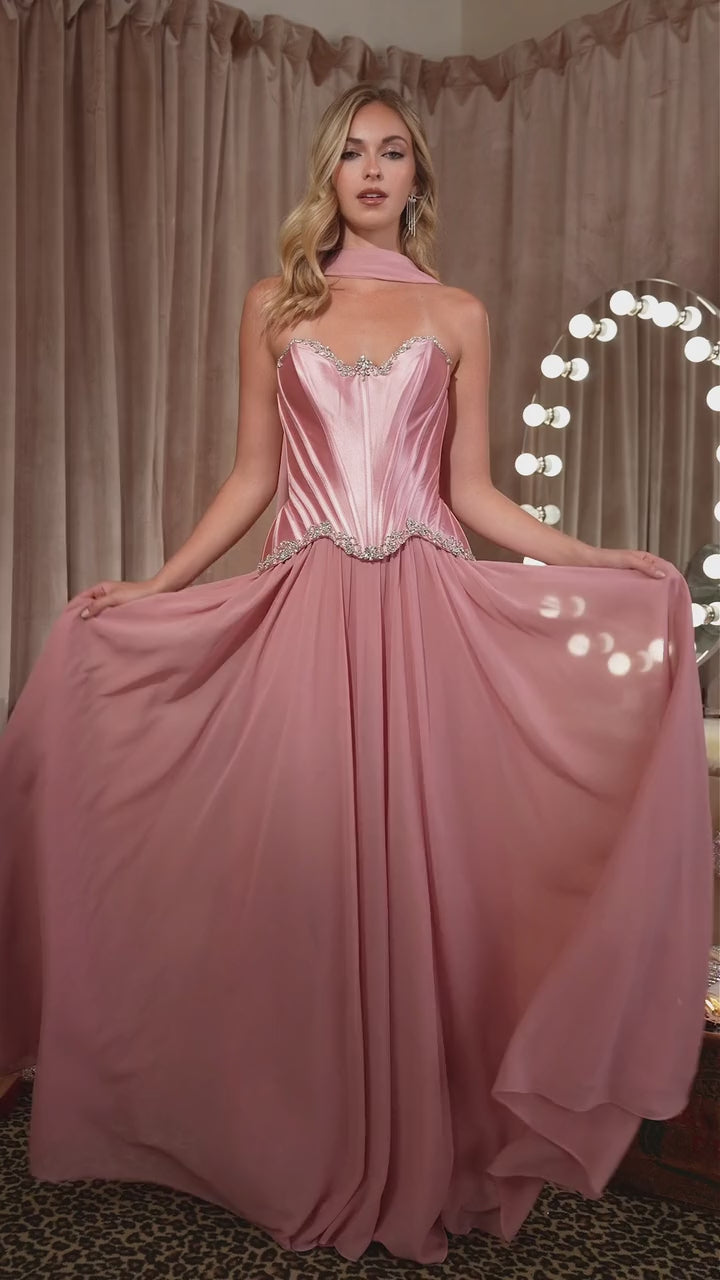 Flowing effortlessly from the fitted bodice, the full chiffon skirt adds soft movement and romantic volume with every step. A lace-up back offers adjustable support and a customized fit, while the matching scarf provides added styling versatility. Perfect for prom, galas, black-tie events, or any formal occasion that calls for drama and sophistication.