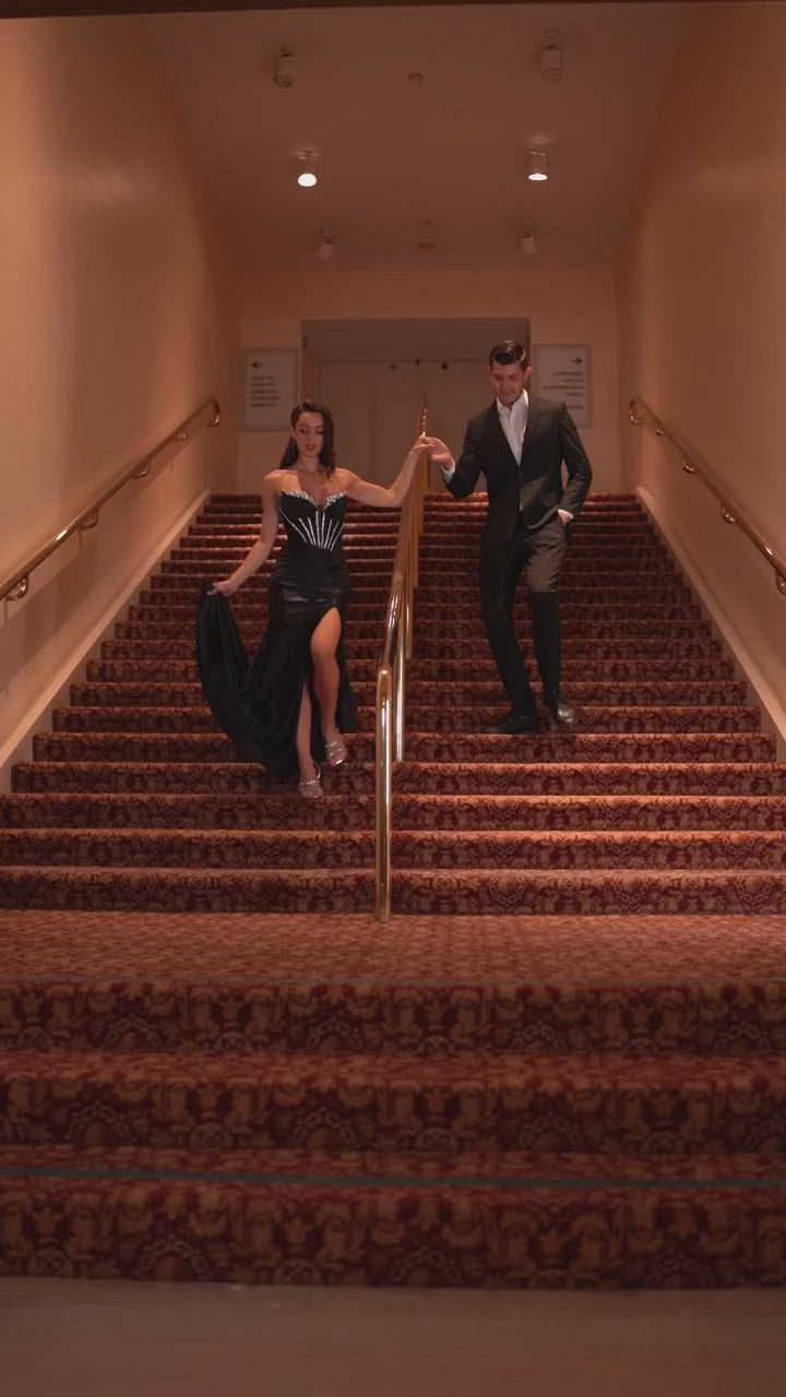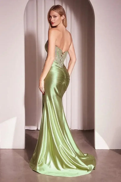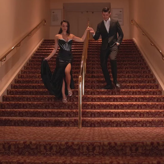 Elevate your formal attire with our Ginger Gown. Designed with a plunging neckline and sheer bodice adorned with rhinestones, this fitted dress exudes glamour. Crafted from crystal-embellished satin and Chantilly lace, it features a pleated hipline and leg slit for a dramatic silhouette. Perfect for prom or black-tie events.