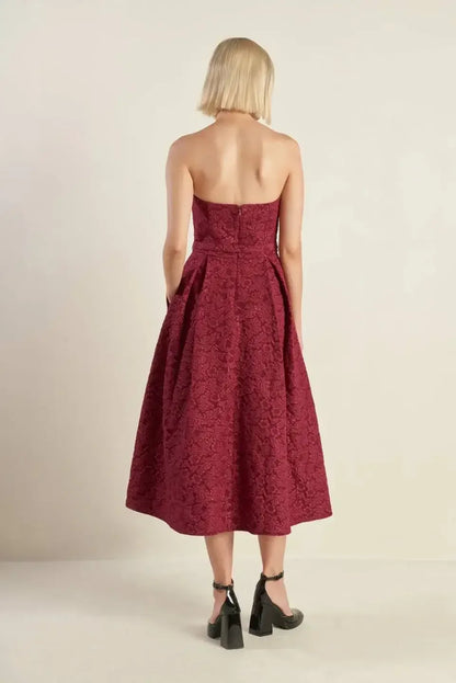 This elegant burgundy midi dress showcases a strapless design with delicate rosette accents, a textured woven fabric, a self-tie belt, a full skirt, and a back zipper closure for a refined silhouette.
