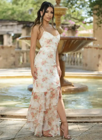 Greta Floral Maxi Dress is figure hugging and a great alternative to traditional formal gowns. It's sexy lace up back shows just enough alongside its skirt slit. This dress is fully lined and has little to no stretch. However, the bust can be adjusted with its lace back.