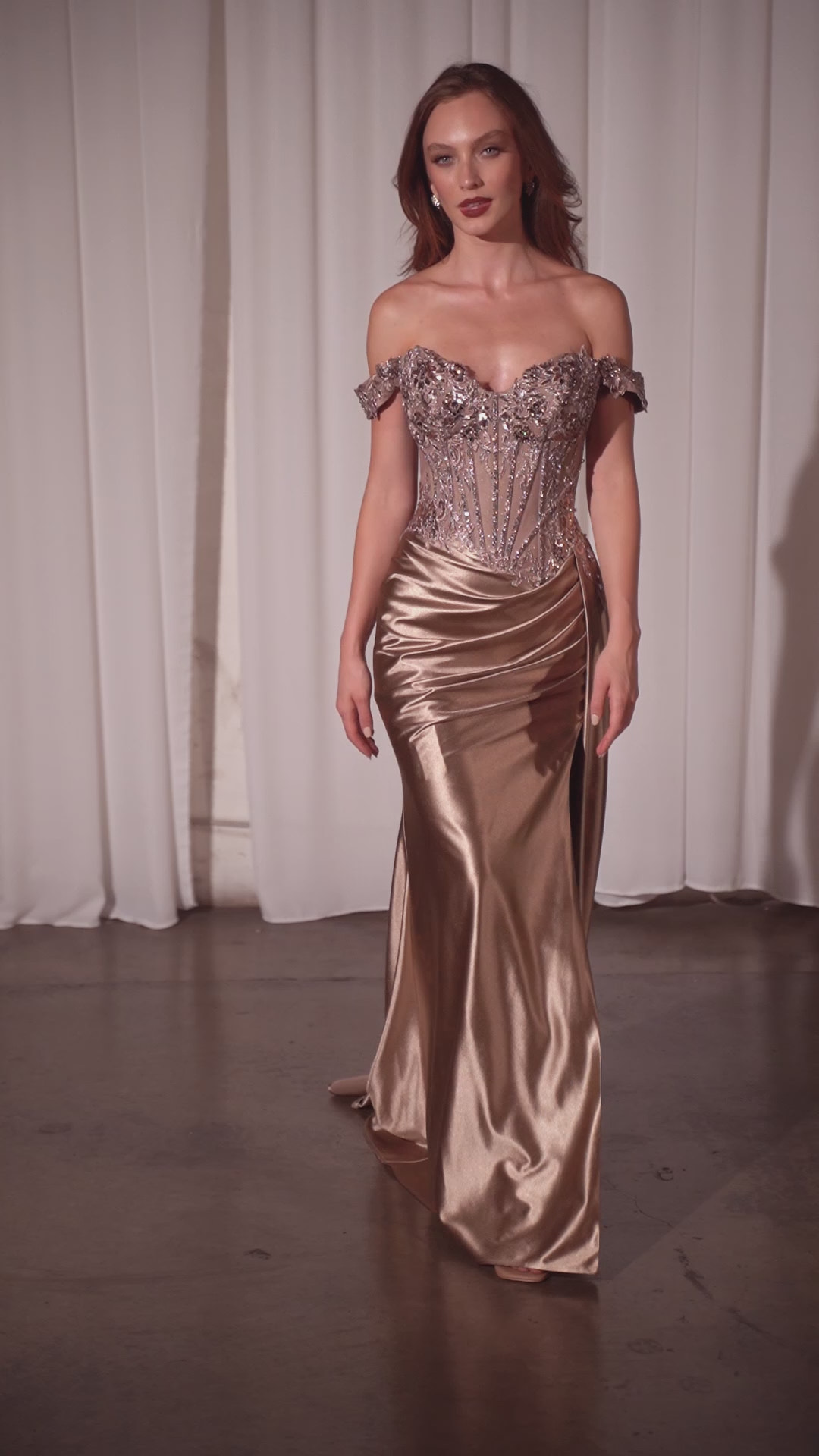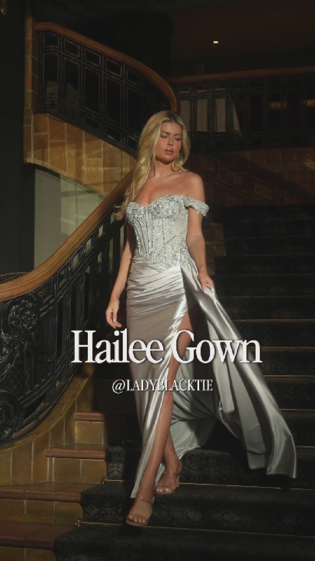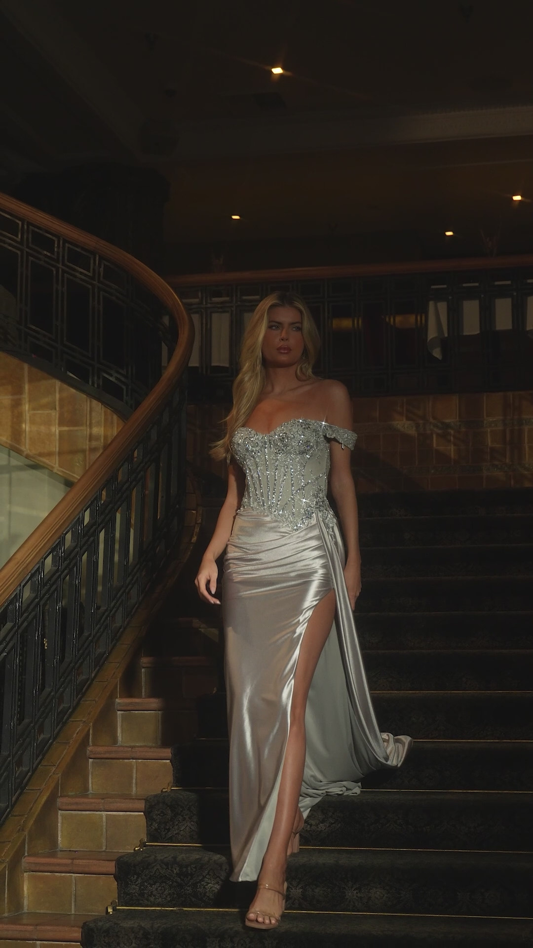 Crafted for both elegance and comfort, the soft satin skirt is gathered at the hip to enhance your curves and flows into a floor-length silhouette. A cascading side sash adds graceful movement, while the tasteful leg slit brings a subtle hint of allure. This gown is a stunning choice for weddings, galas, formal events, black tie evenings.