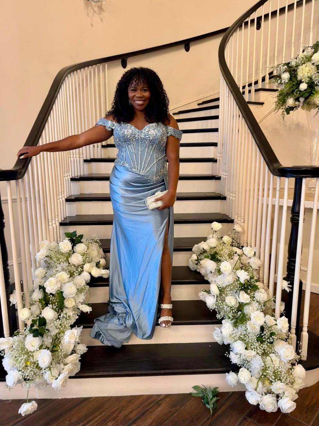 Crafted for both elegance and comfort, the soft satin skirt is gathered at the hip to enhance your curves and flows into a floor-length silhouette. A cascading side sash adds graceful movement, while the tasteful leg slit brings a subtle hint of allure. This gown is a stunning choice for weddings, galas, formal events, black tie evenings.